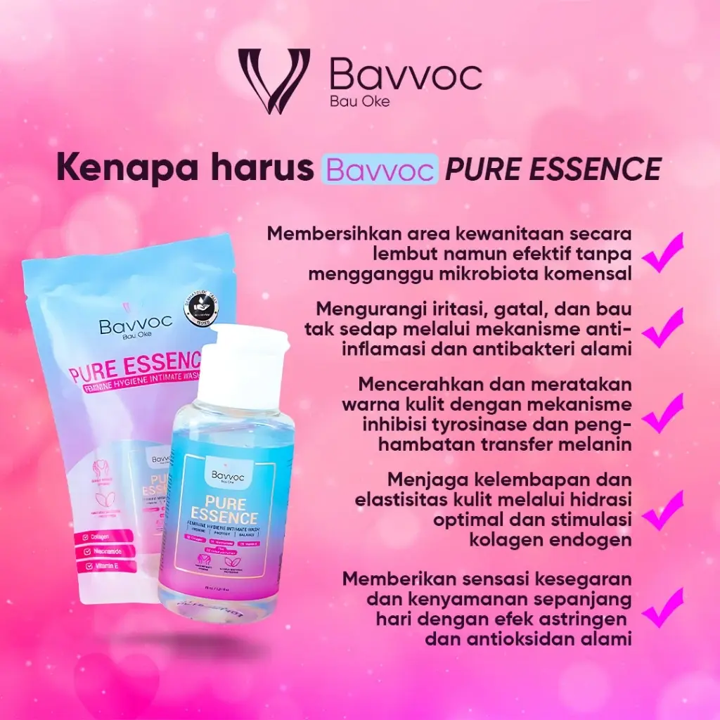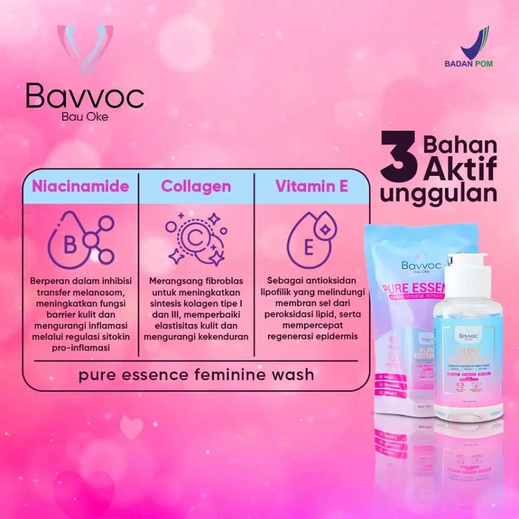 âš BAVVOC Pure Essence Feminine Wash - Sabun kewanitaan pH balance Niacinamide, Propolis, Manjakani. BPOM. Kenapa lebih kuat: "Feminine Wash" + "Sabun Kewanitaan" = kata kunci utama. "pH Balance" banyak dicari pembeli yang peduli kesehatan area intim. "Niacinamide Propolis Manjakani" kandungan unggulan. Tetap ada BPOM bikin trust.