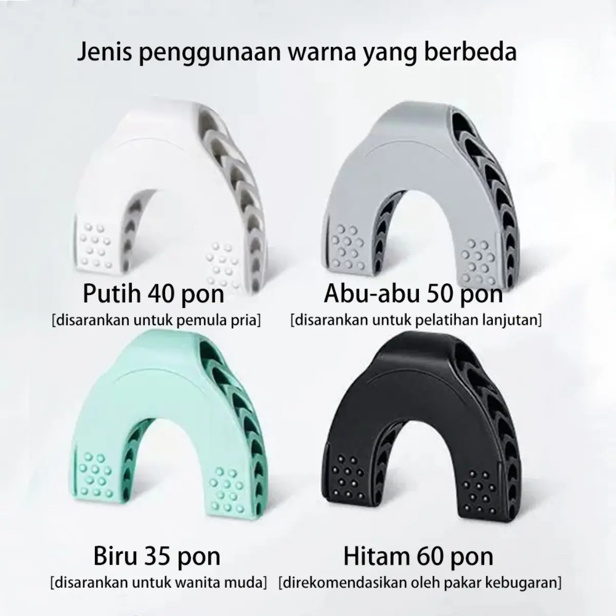 Manfaat Alat Pelatihan Wajah, Membentuk Garis Rahang, Melalui latihan otot wajah secara konsisten alat ini membantu membentuk garis rahang yang jelas dan terdefinisi dengan baik, Meningkatkan Kontur Wajah, Alat ini merangsang berbagai kelompok otot wajah untuk menciptakan kontur wajah yang lebih tiga dimensi dan mengurangi kekenduran, Untuk Semua Jenis Kelamin, Produk ini cocok digunakan baik oleh pria maupun wanita untuk meningkatkan penampilan dan kesehatan otot wajah mereka, Portabel dan Praktis, Desainnya yang ringkas dan ringan memudahkan Anda membawa serta menggunakan alat ini kapan saja dan di mana saja tanpa memerlukan persiapan khusus, Meningkatkan Sirkulasi Darah, Selama penggunaan alat latihan wajah memberikan efek pijatan lembut yang meningkatkan sirkulasi darah membantu mengurangi pembengkakan dan mengatasi wajah yang lelah