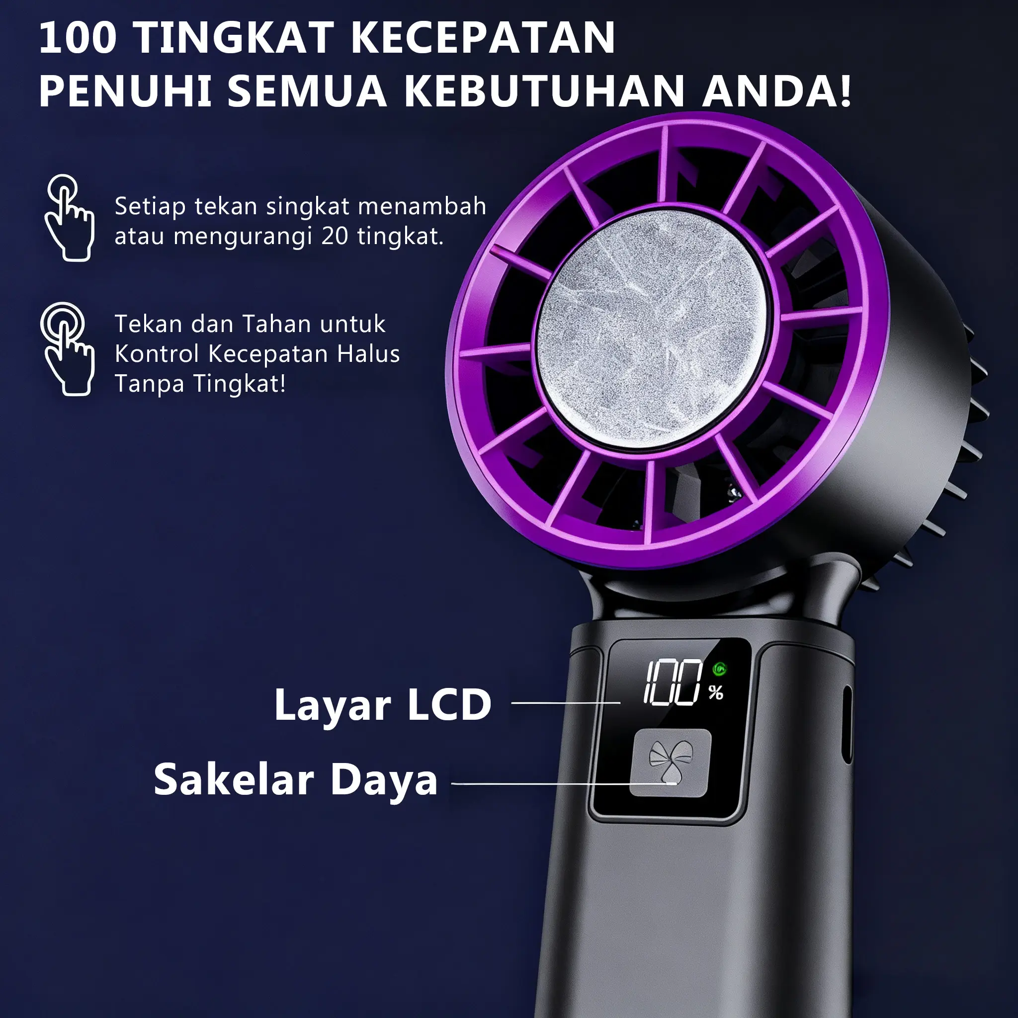 3.Klik satu kali tombol daya untuk menyalakan kipas. Klik/tahan tombol daya untuk menyesuaikan kecepatan kipas.