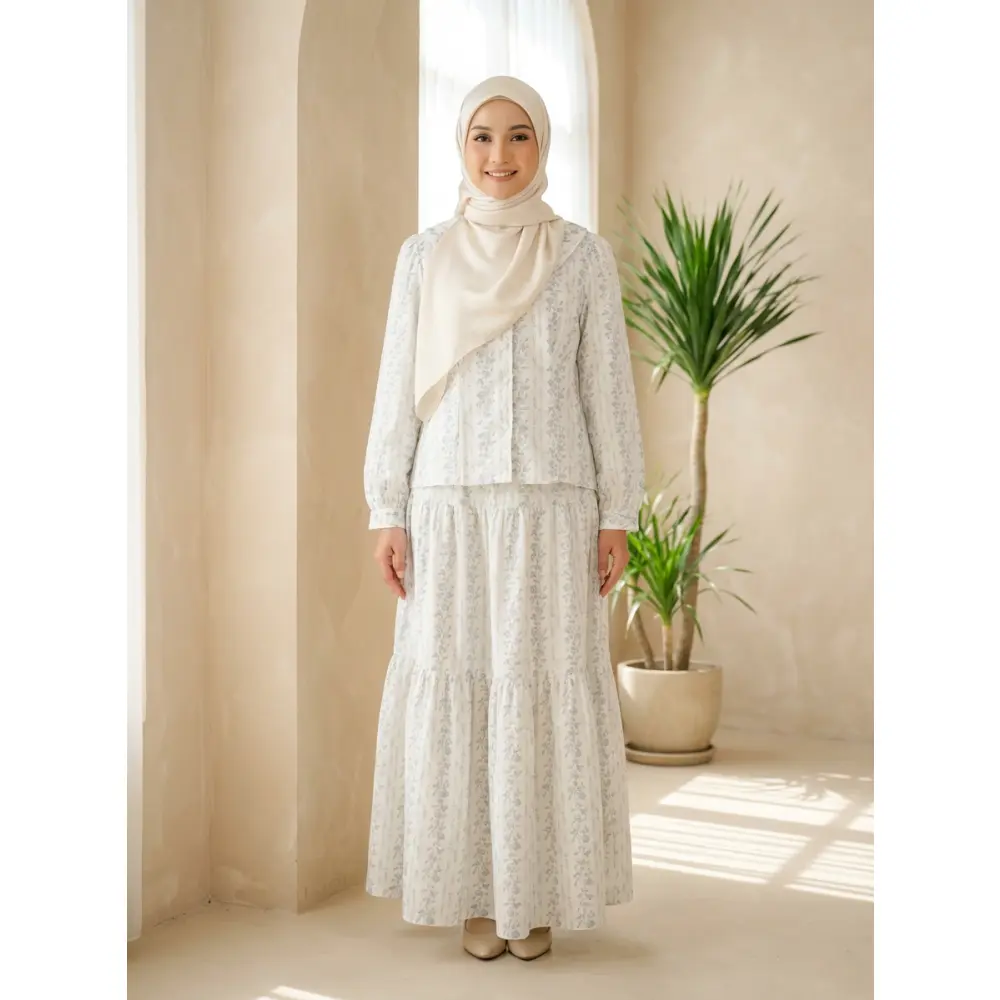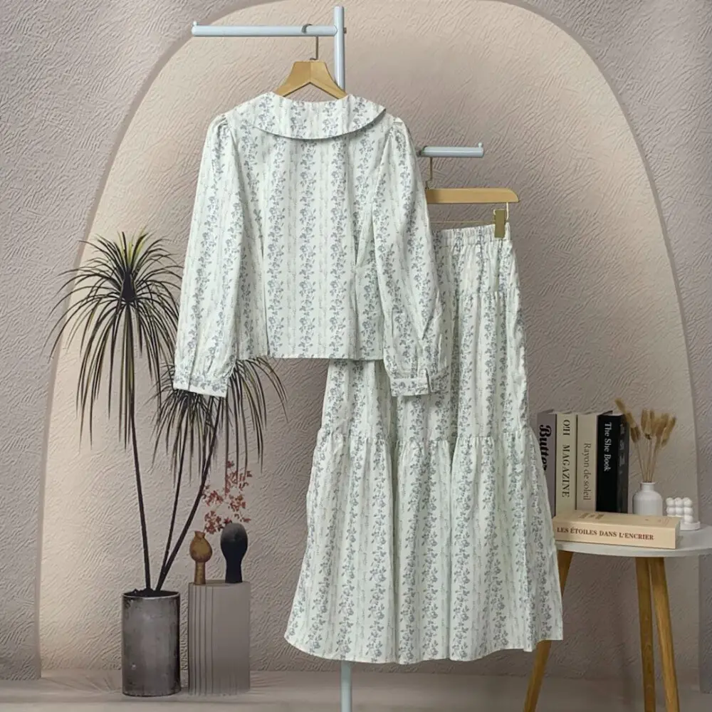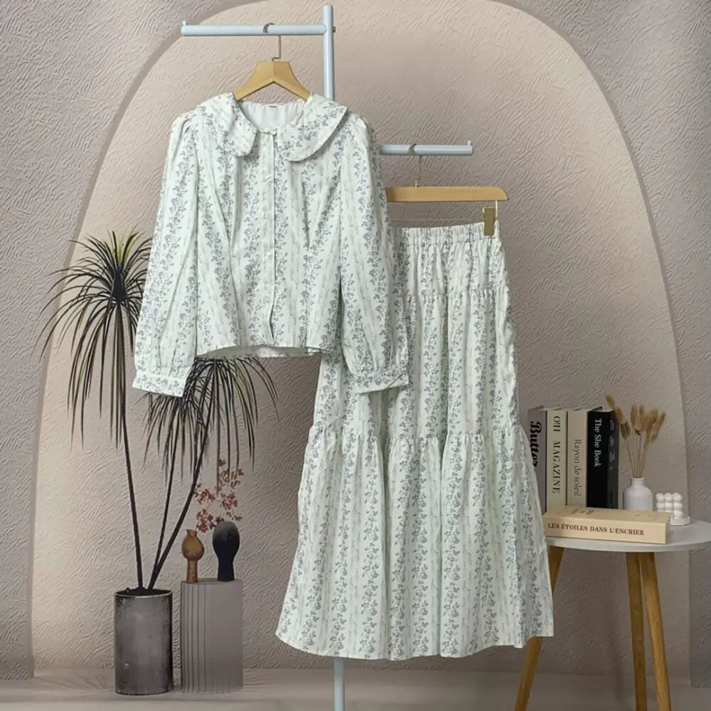 Asaya Rok kemeja lengan panjang leher awak setelan bunga