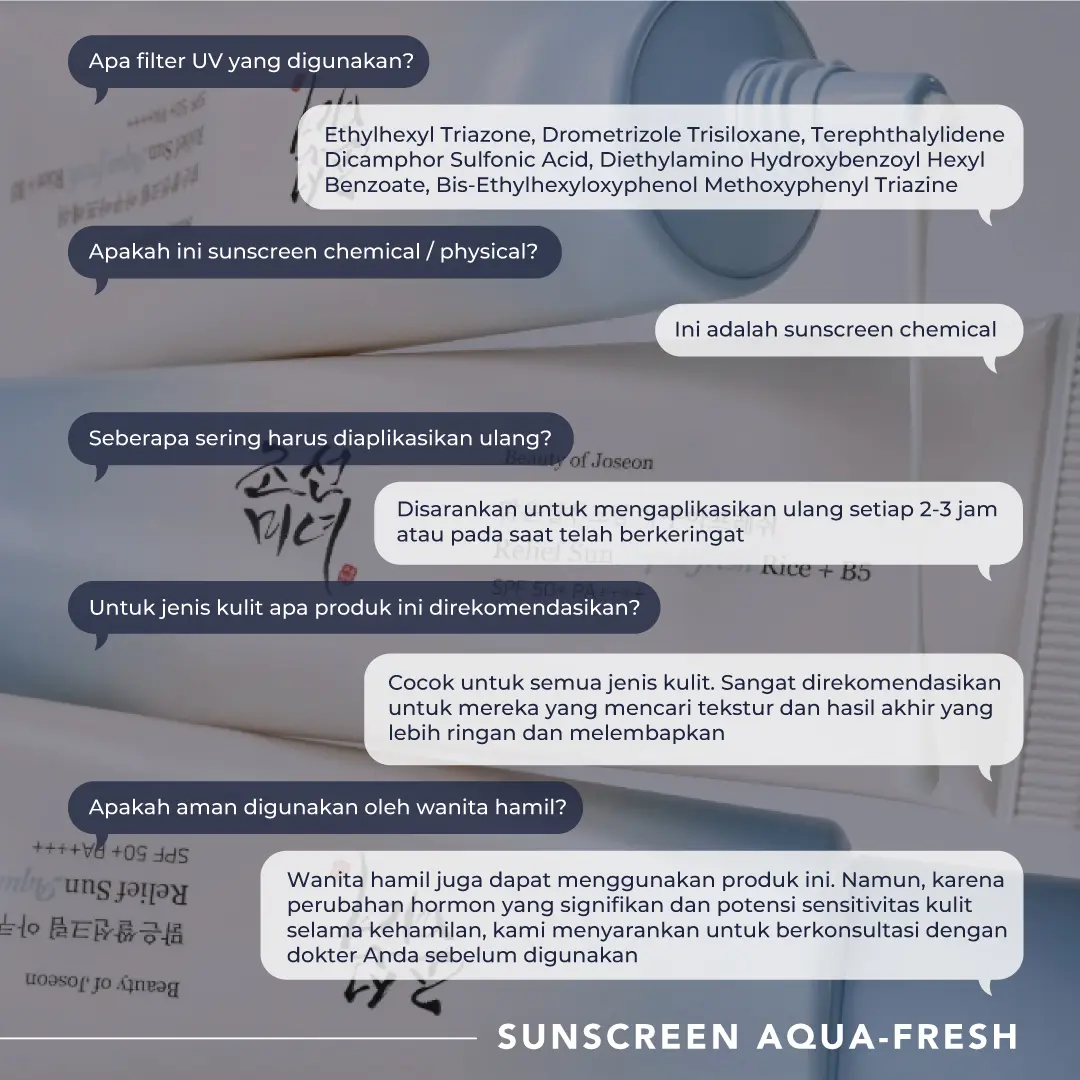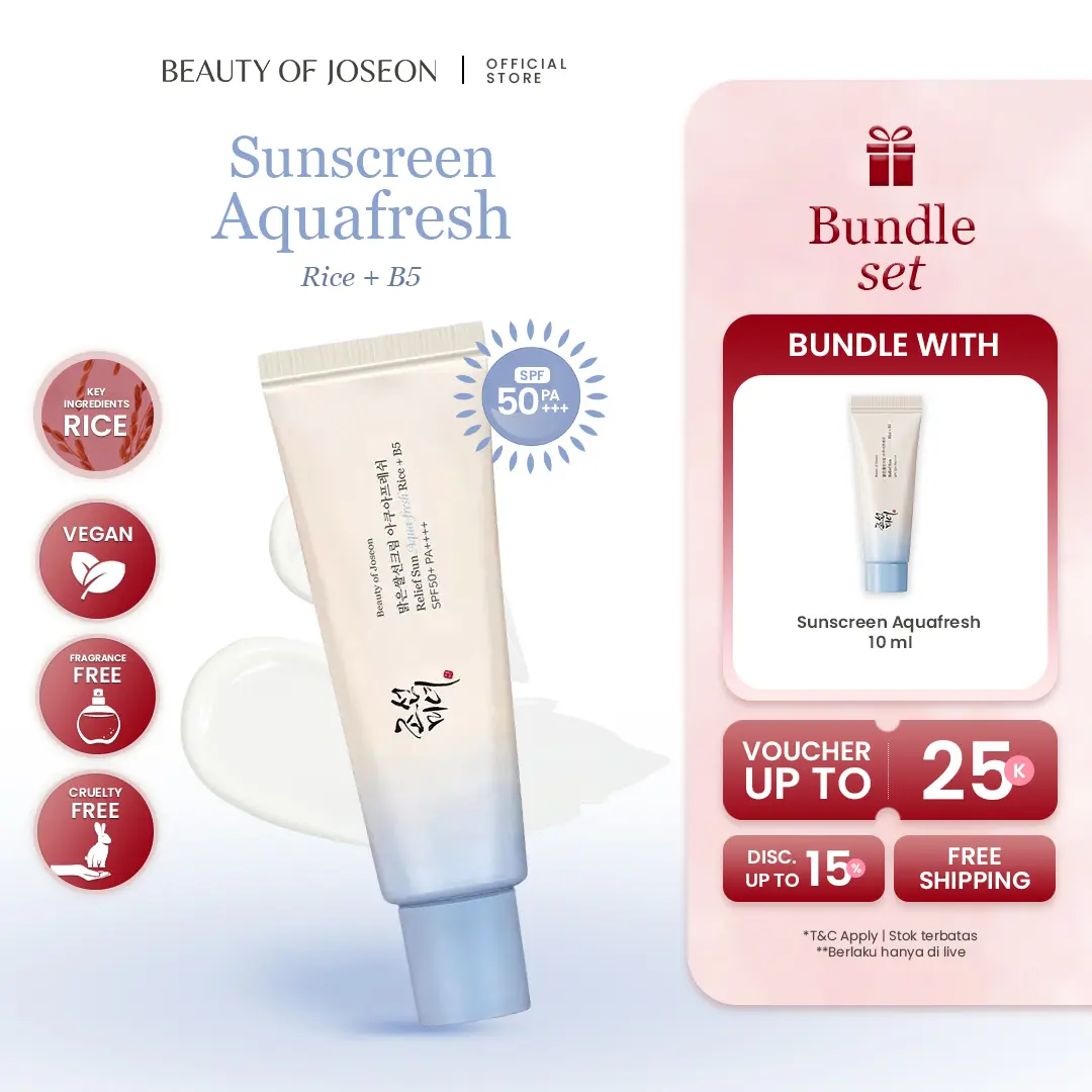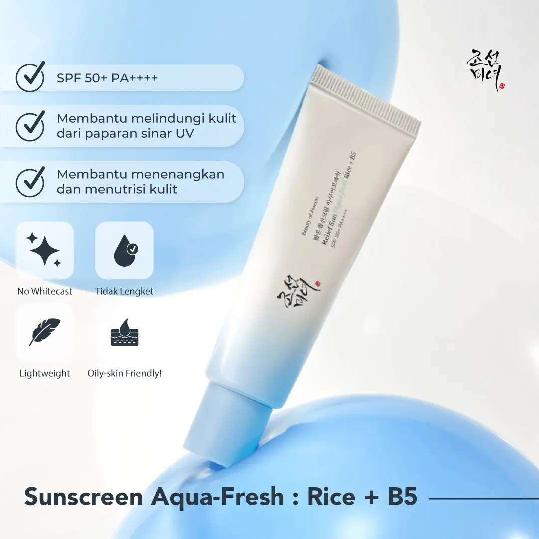 Sunscreen Aqua-fresh : Rice + B5 50ml diformulasikan dengan SPF 50+ PA++++ untuk membantu memberikan perlindungan dari paparan sinar UV. Memiliki tekstur cream yang ringan, tidak lengket, serta cepat menyerap di kulit sunscreen ini dapat membantu menjadikan kulit tampak lembab dan sehat tanpa meninggalkan whitecast. Mengandung Rice Seed Water yang kaya akan vitamin, mineral, dan antioksidan yang berfungsi untuk membantu merawat kulit wajah, membantu mencerahkan, dan membantu memberikan tampilan kulit yang lebih segar serta Panthenol (Vit B5) yang membantu menjaga kelembapan kulit, membantu memberikan efek menenangkan, dan membantu mendukung perawatan kulit wajah