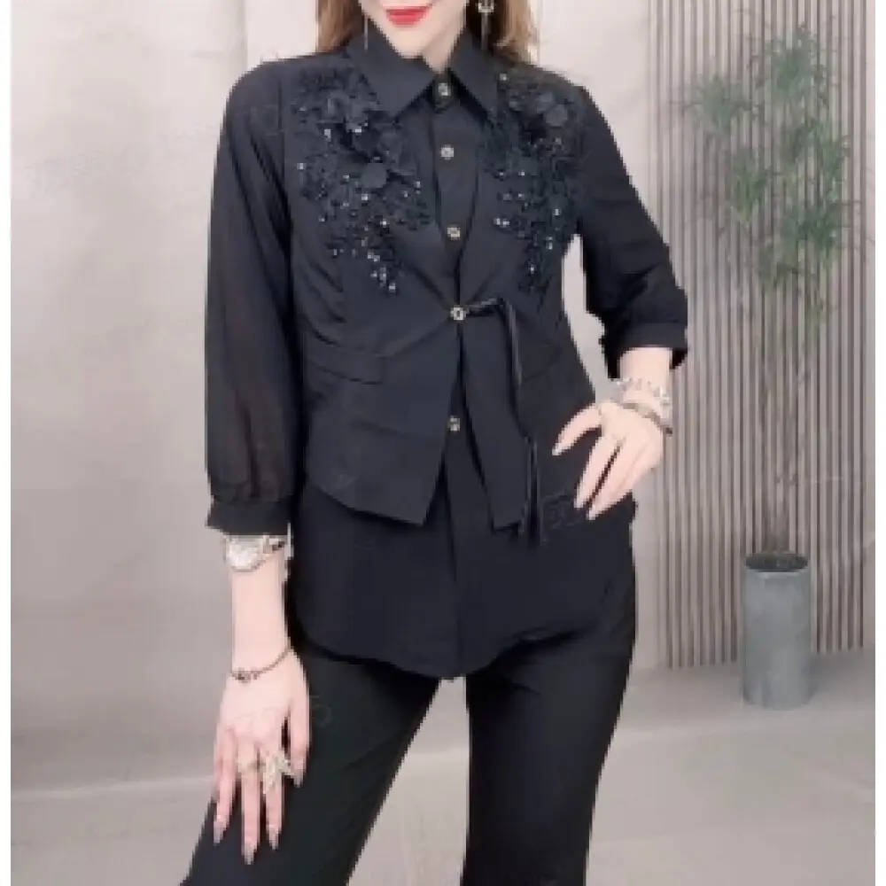 FADFAD Setelan dua potong wanita kelas atas gaya modis dengan variasi bunga cantik warna solid + celana panjang
