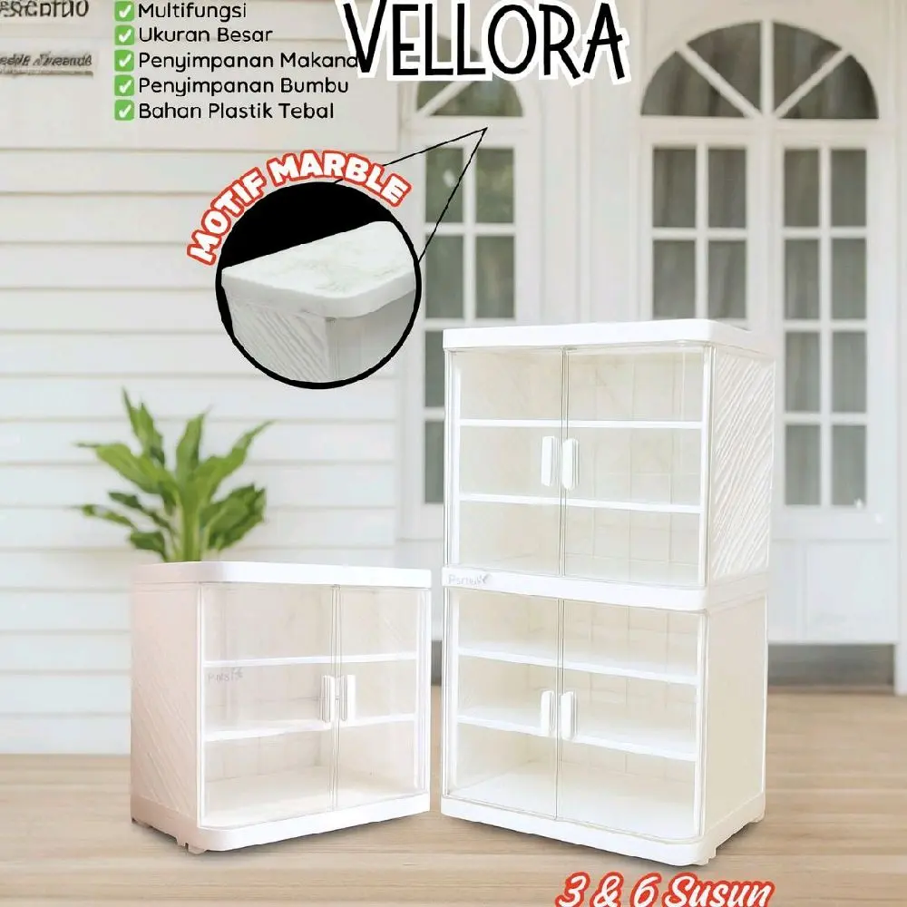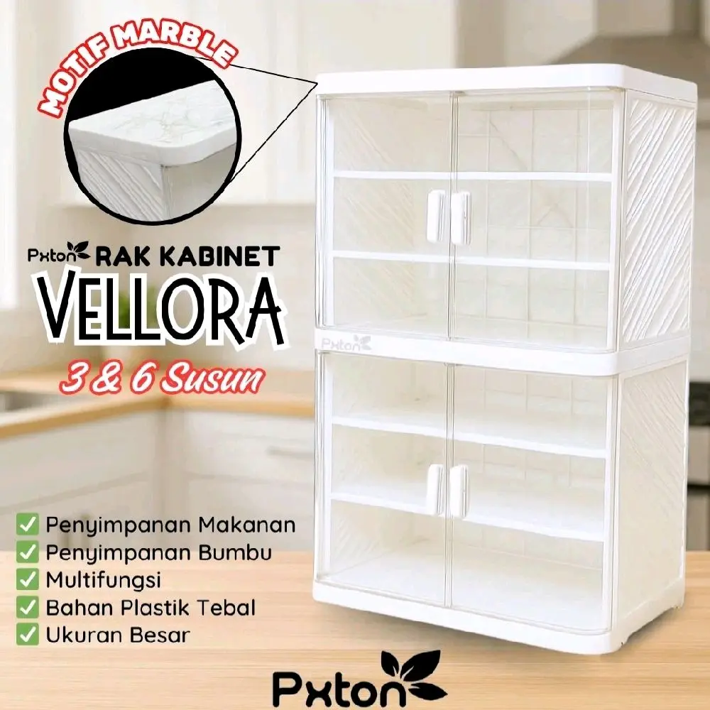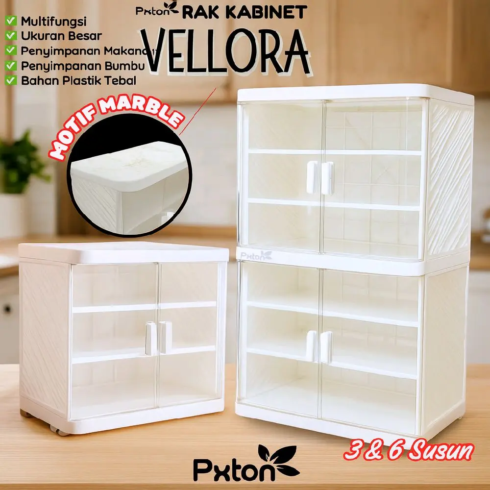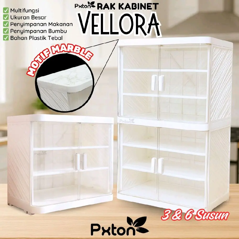 Rak Kabinet VELLORA hadir dengan desain modern dan elegan berwarna putih serta motif marble di bagian atas yang memberikan kesan mewah dan bersih pada dapur atau ruang penyimpanan Anda. Terbuat dari bahan plastik tebal berkualitas tinggi, rak ini kuat, tahan lama, dan mudah dibersihkan.