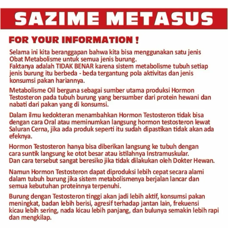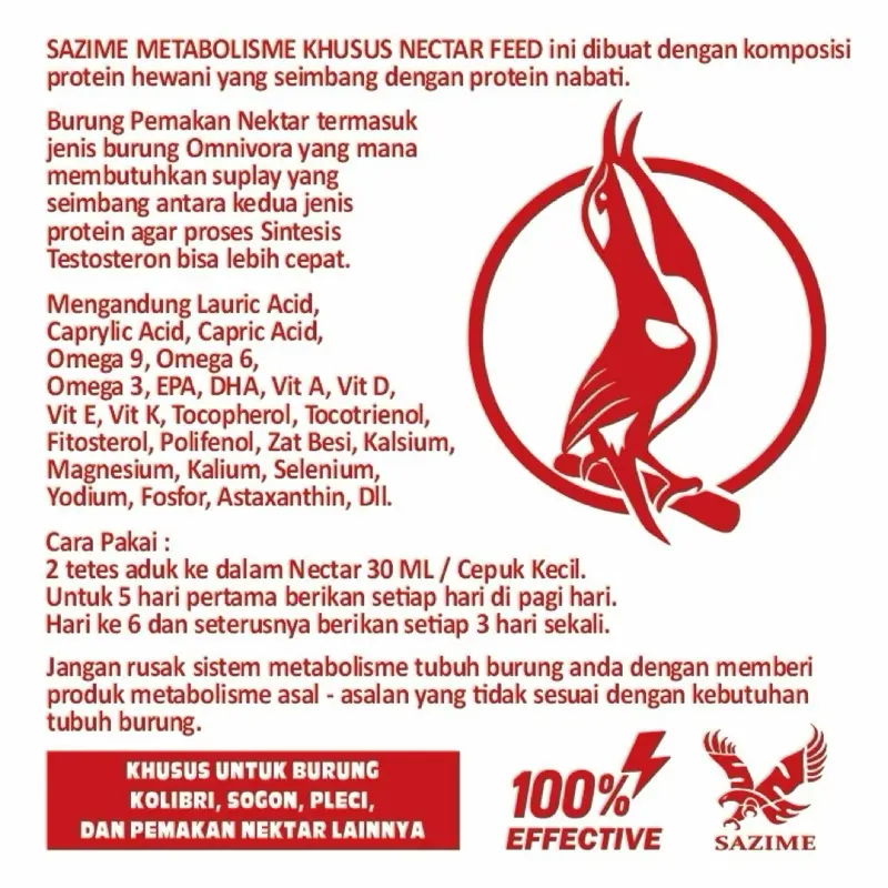 Produk terbaru dari SAZIME adalah Sazime Metasus Nectar Feed. Produk ini merupakan Metabolisme Oil khusus untuk burung pemakan nektar yang mengalami masalah macet gacor.