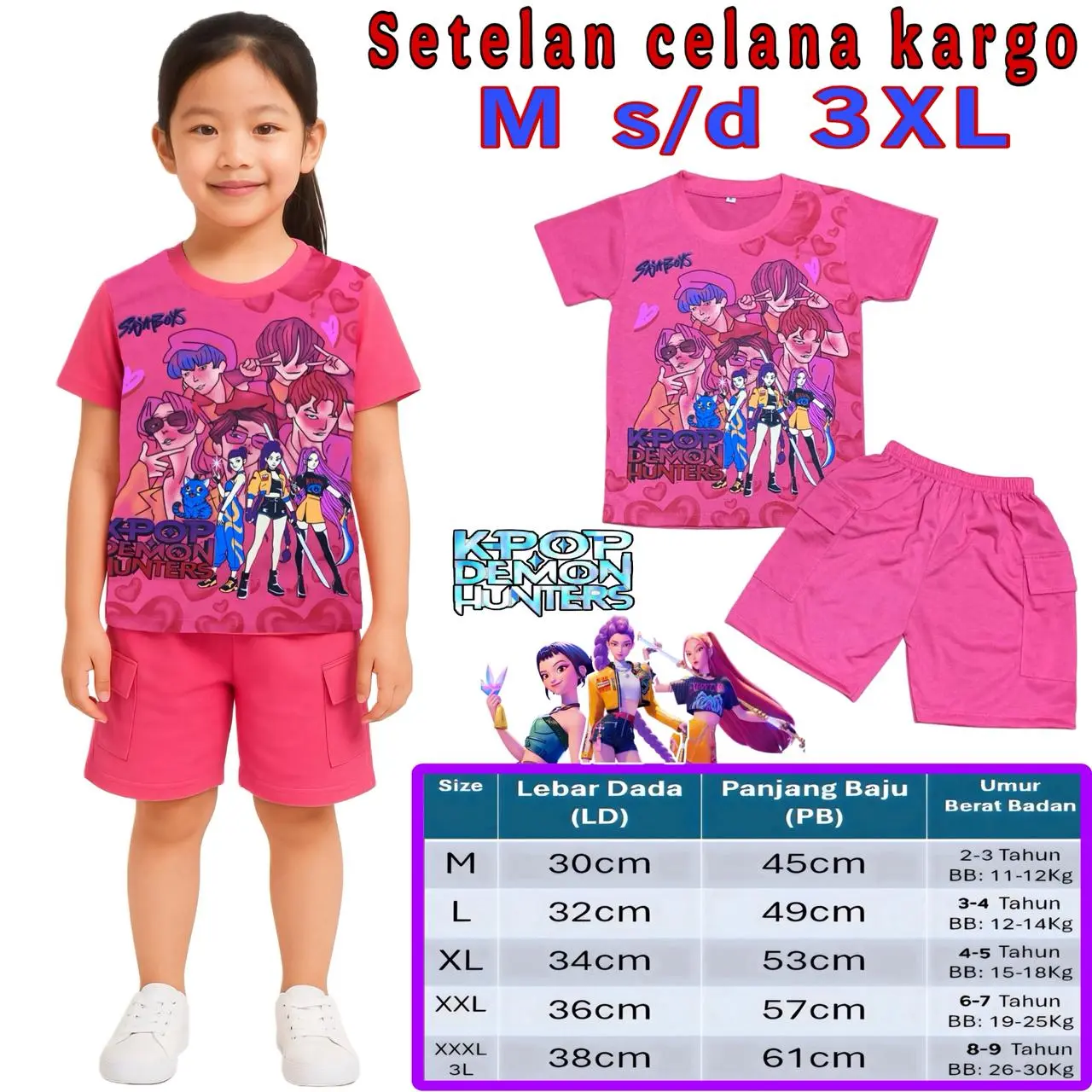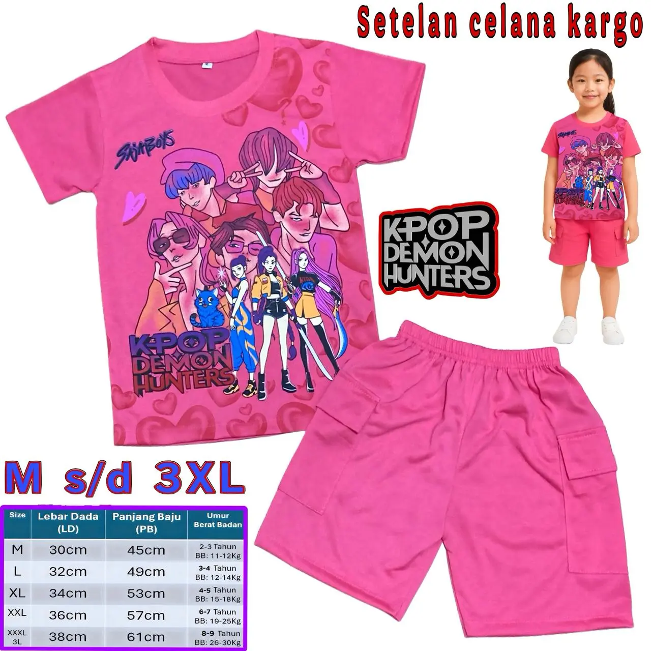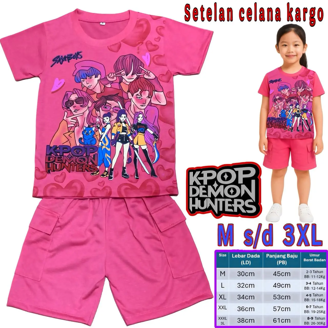 Setelan anak perempuan ini adalah pilihan tepat untuk anak cewek. Dengan celana cargo motif Huntrik dan gambar Demon Hunters, setelan ini akan membuat anak Anda tampil menarik. Cocok untuk aktivitas sehari-hari.