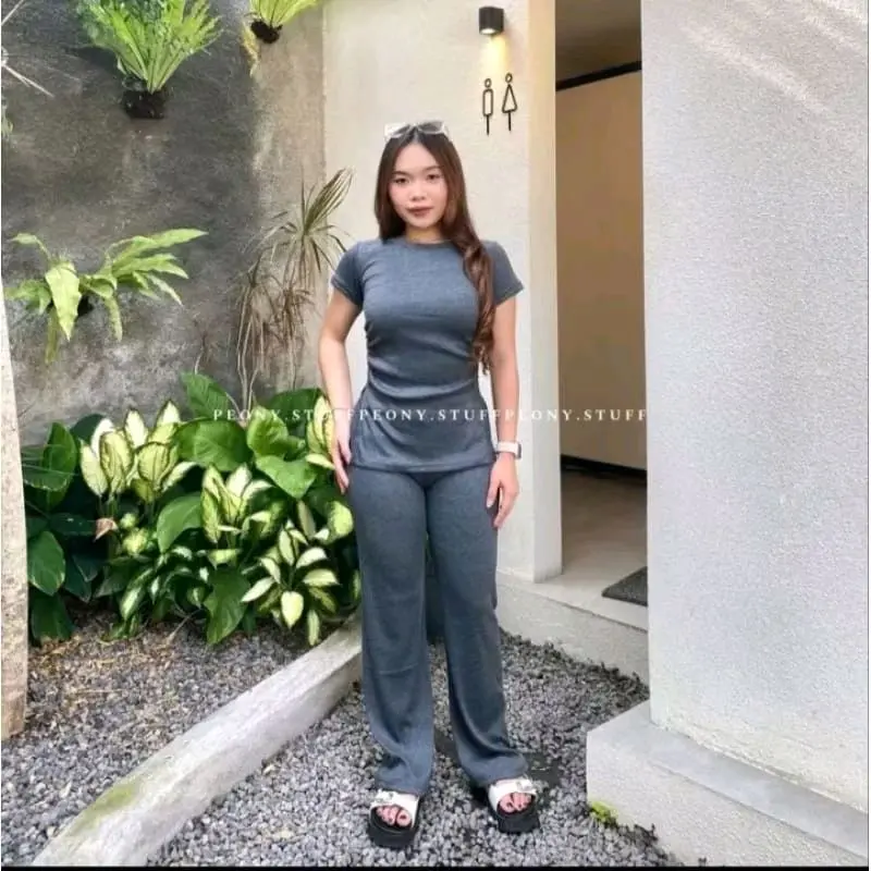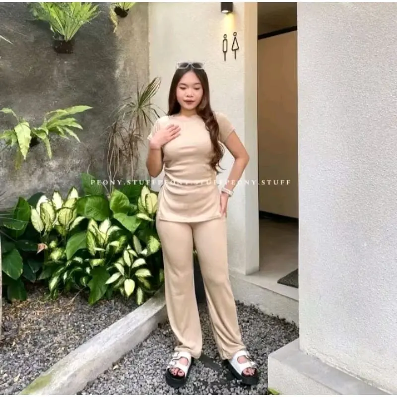 One Set Knit Penelope Rib Wanita Kekinian Staylist/ Setelan Santai Ootd Celana Kulot Panjang Top