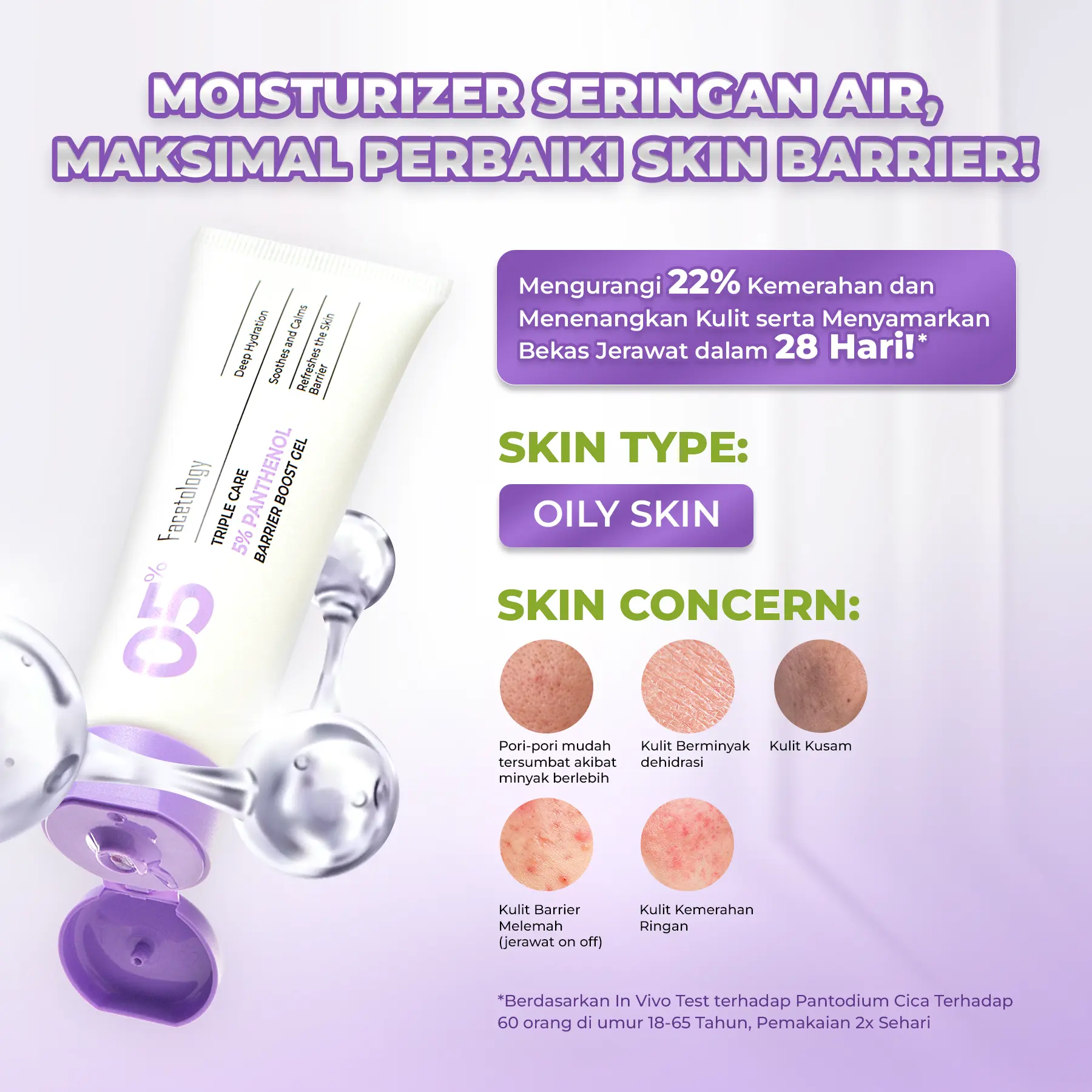 Diperkaya dengan 5% Panthenol (Pro-Vitamin B5), pelembab ini membantu menyegarkan kulit dan menjaga kelembaban sepanjang hari tanpa terasa berat di kulit. Triple Care 5% Panthenol Barrier Boost Gel memiliki texture Water Gel, Seringan air, langsung menyerap tanpa rasa lengket. Segar & ringan, cocok buat kulit berminyak maupun acne-prone.