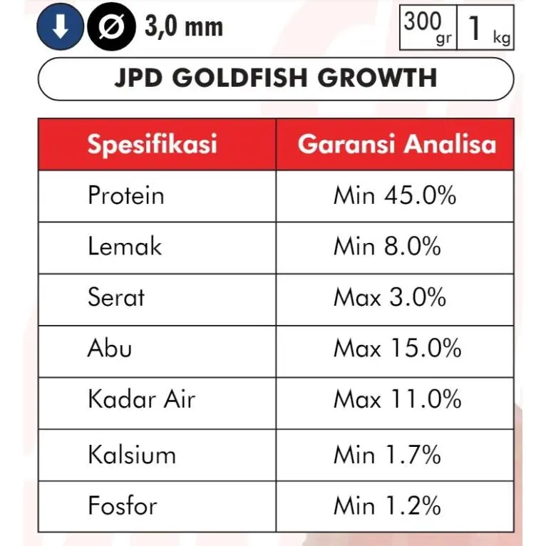 - Harga tertera untuk 1 Produk JPD Goldfish Growth 300Gr atau 1Kg sesuai Varian yang dipilih ketika pemesanan.