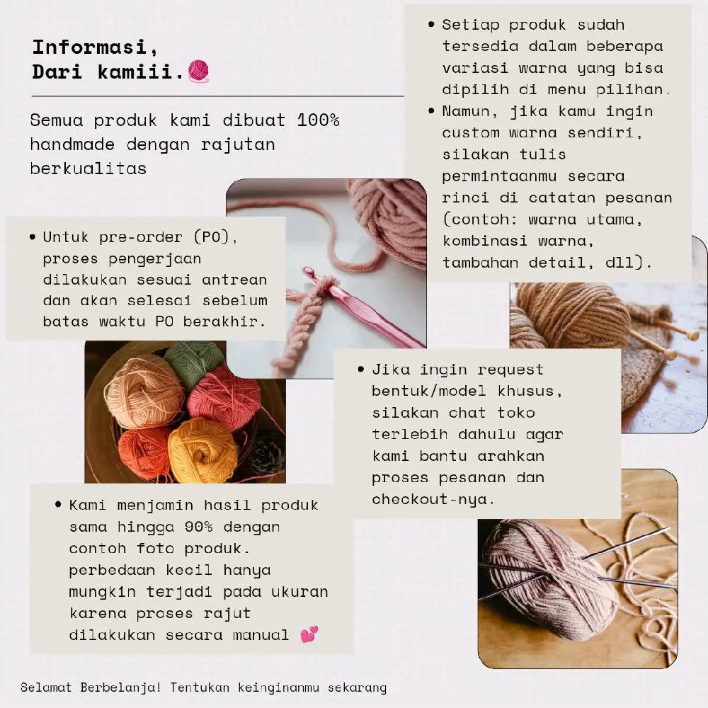 * Bahan: Benang rajut premium (lembut & kuat)