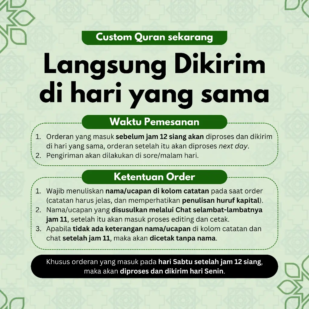 1. Untuk Al Quran custom memerlukan maksimal -+2 hari kerja, bisa lebih cepat tergantung kondisi overload/tidak, belum termasuk pengiriman.