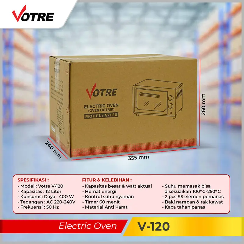 Oven ini sangat cocok untuk kebutuhan memasak rumah tangga. Dengan kapasitas 12L, Anda dapat memasak makanan dalam jumlah banyak. Pemanas atas dan bawah memberikan fleksibilitas dalam memasak. Bahan stainless steel menjamin keawetan dan kebersihan. Low watt 400 Watt membuatnya hemat energi dan aman digunakan.