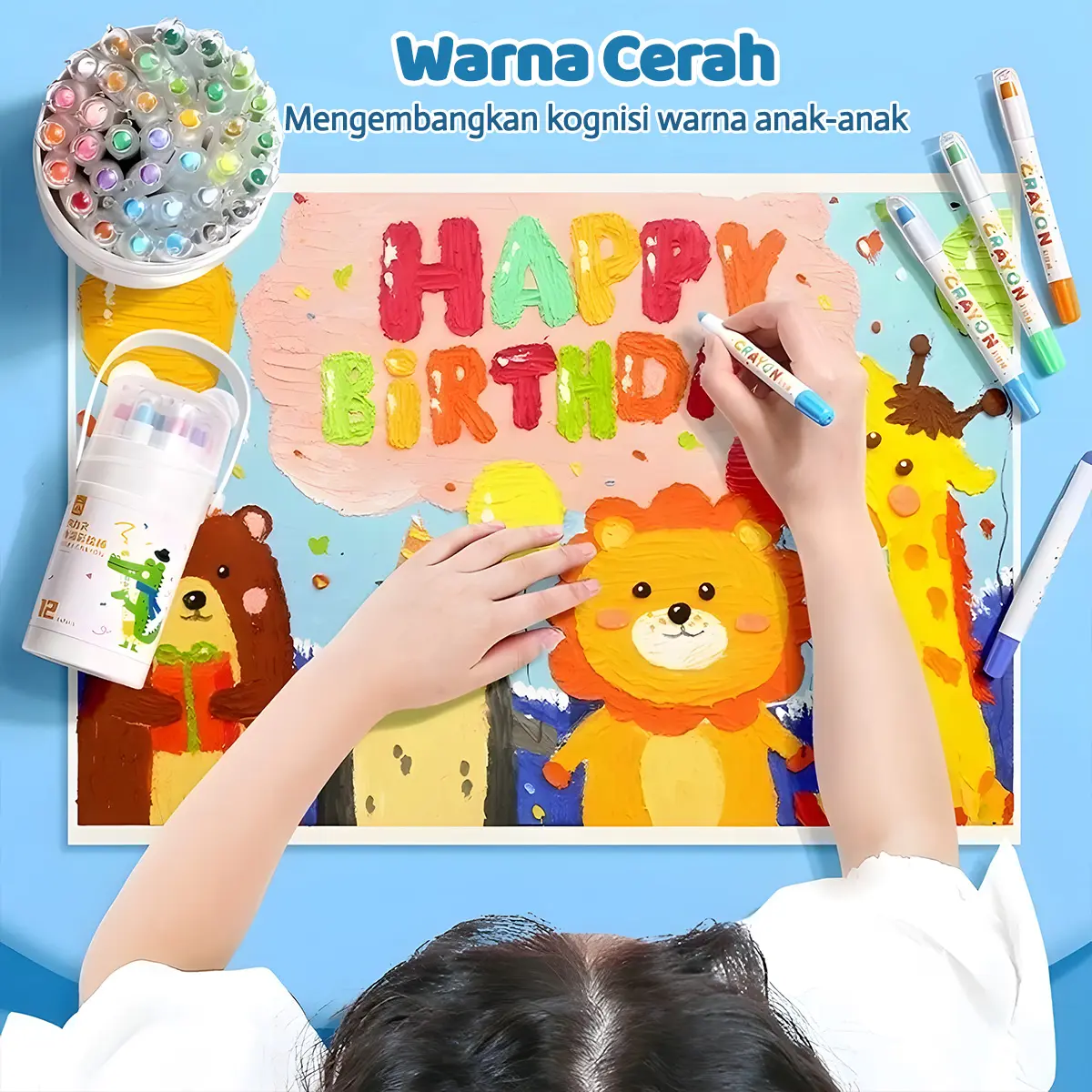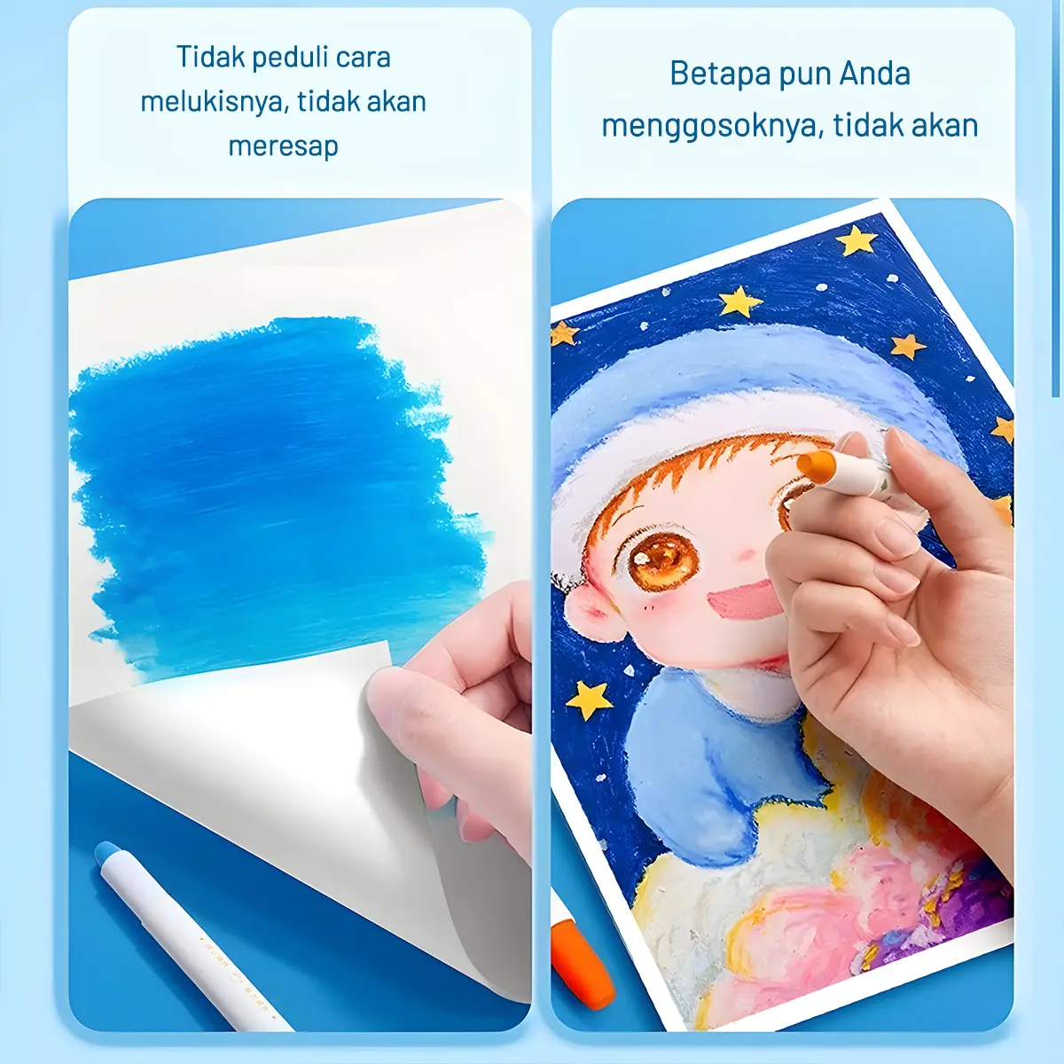 Krayon yang Dapat Dicuci: Krayon ini tidak akan meninggalkan noda di tangan Anda. Noda pada tekstil dapat dengan mudah dihilangkan dengan mencuci tangan menggunakan sabun.