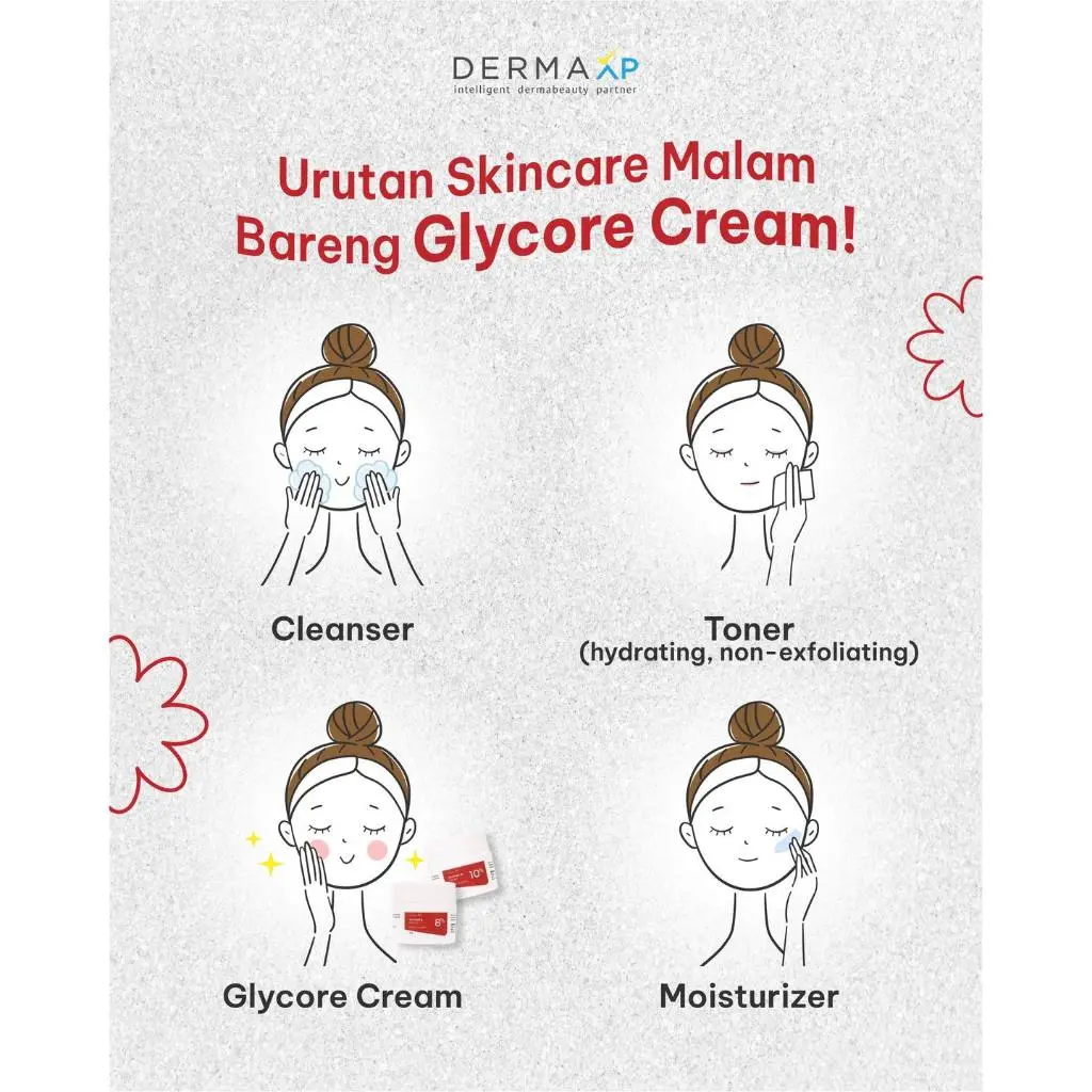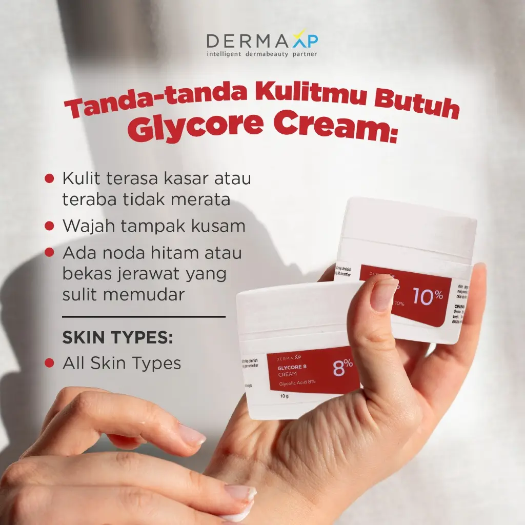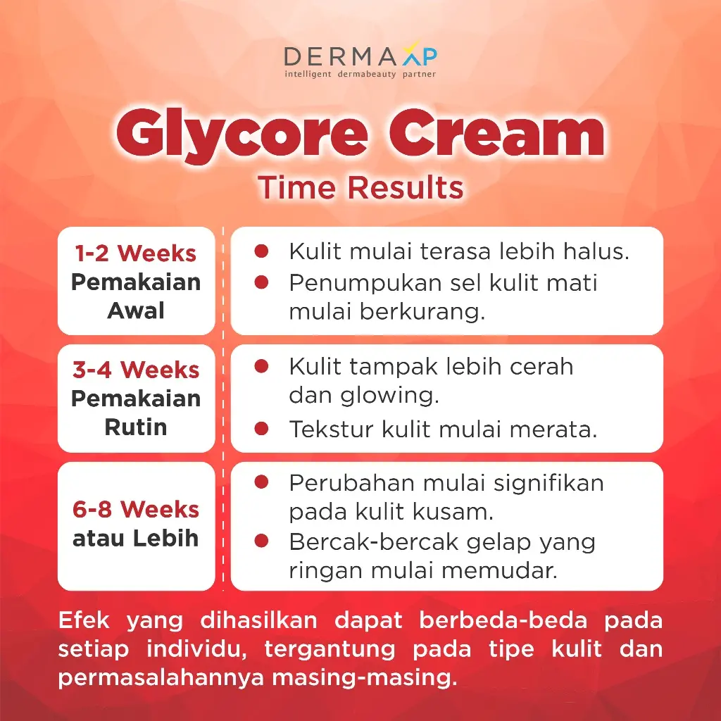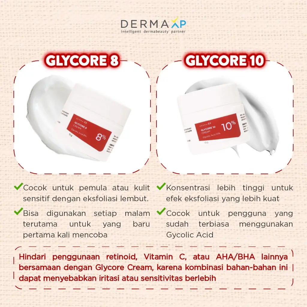 Derma XP Glycore 8 Cream Glycolic Acid 8% adalah krim moisturizer pelembab wajah untuk mengatasi hiperpigmentasi dan menyamarkan noda hitam. Mengandung Glycolic Acid 8% yang dapat digunakan sehari-hari. BPOM NA18190105345.