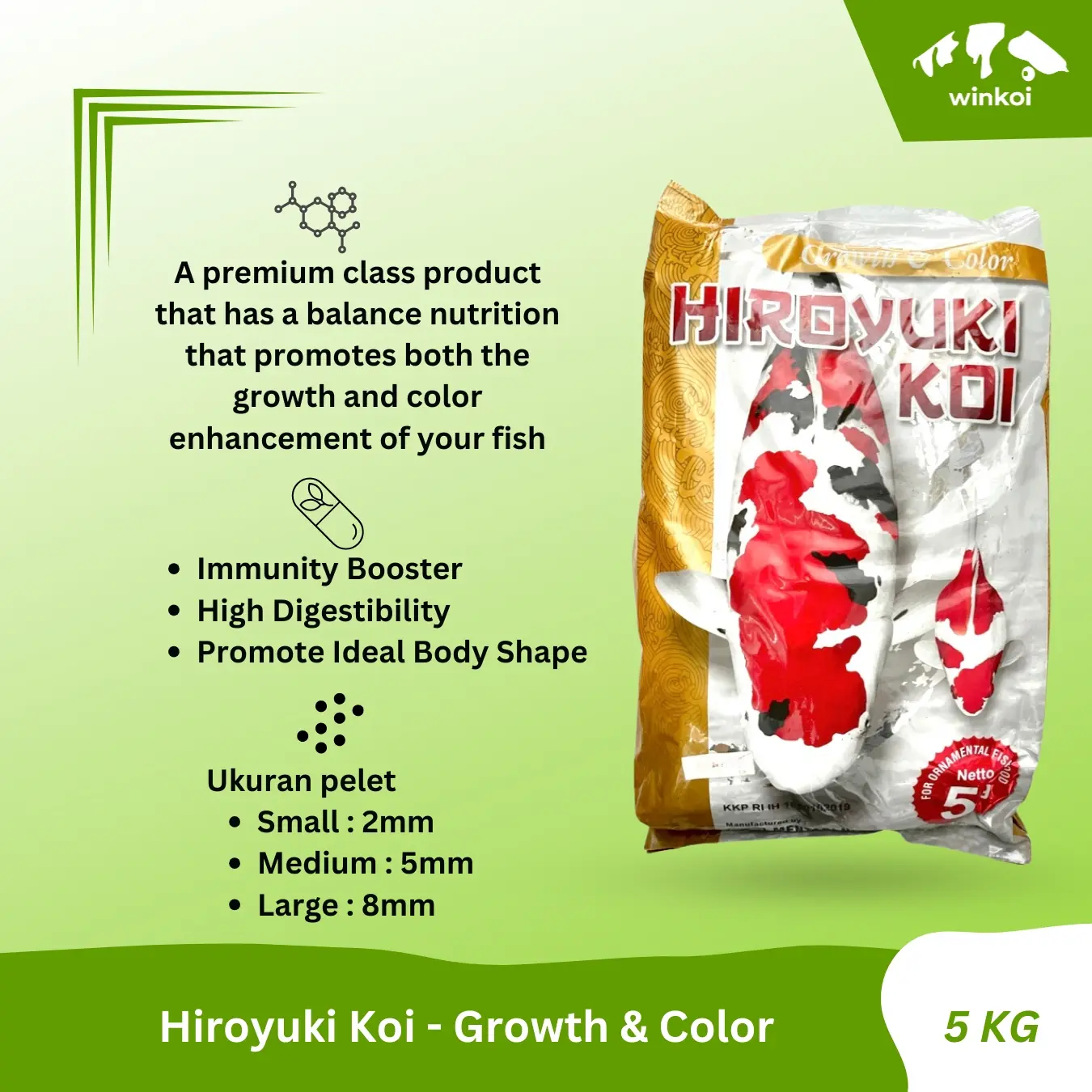 Hiroyuki Koi - Pelet Ikan Koi Growth and Color 5Kg Size S/M/L Floating Nutrisi Premium untuk Pertumbuhan dan Warna Ikan dengan Protein 43% dan Lemak 5%