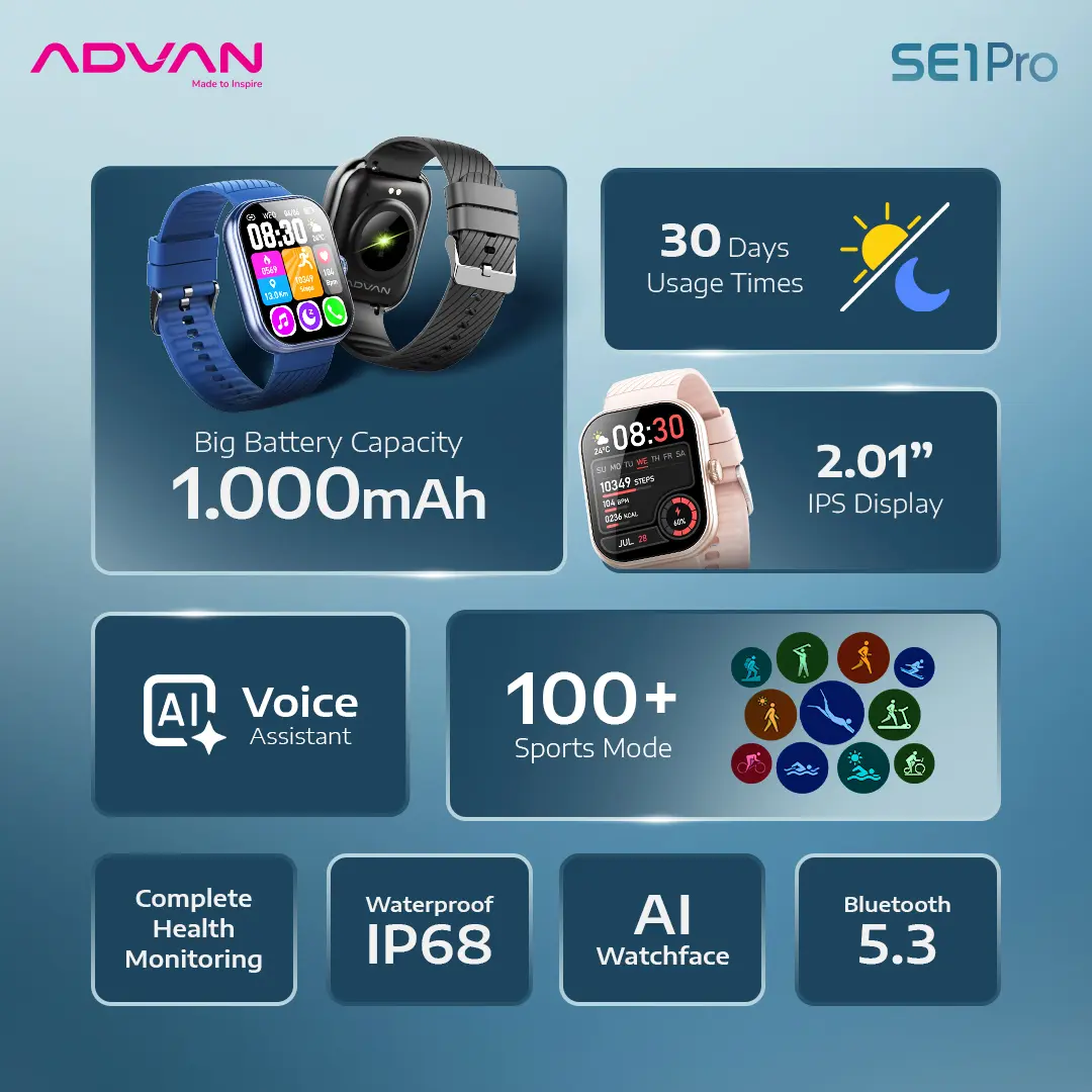 5. ADVAN Smartwatch SE1 Pro 2.01” inch 100+ Sports Modes Smart AI Assistant Bluetooth Call Waterproof IP68 1000mAh Up To 120 Days Standby Time