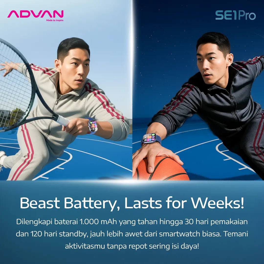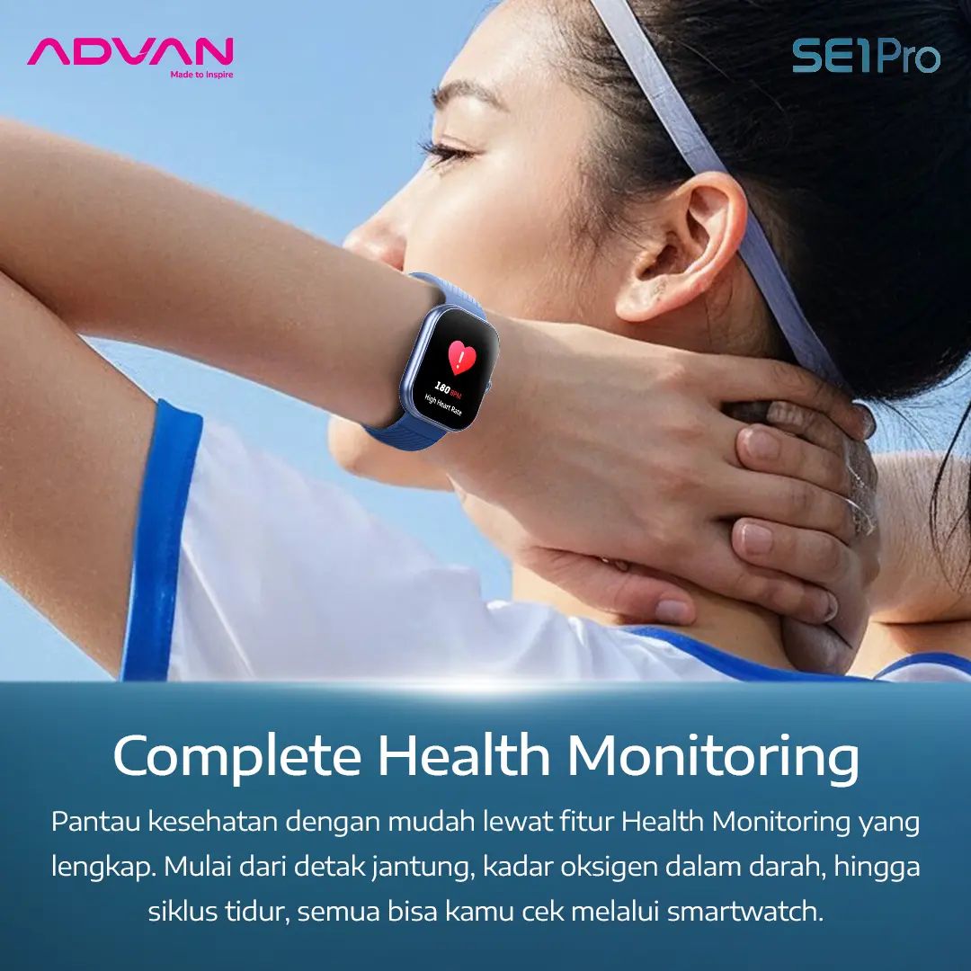 ADVAN SMARTWATCH SE1 PRO 2.01” 100+ SPORTS MODES SMART AI ASSISTANT BLUETOOTH CALL WATERPROOF IP68 Tingkatkan gaya hidup sehat dan modern Anda dengan ADVAN SE1 Pro, smartwatch pintar yang menggabungkan desain elegan, teknologi mutakhir, dan daya tahan luar biasa. Layar Lebar & Jernih Dilengkapi dengan layar IPS 2.01 inci beresolusi tinggi, menampilkan tampilan yang tajam dan jelas dari segala sudut. Baterai Super Besar 1000mAh Nikmati penggunaan hingga 30 hari (berdasarkan pemakaian normal dan pengaturan standar. Durasi dapat bervariasi tergantung penggunaan dan pengaturan fitur) dalam sekali pengisian. Tak perlu repot sering-sering mengisi daya—sempurna untuk aktivitas harian maupun perjalanan jauh. AI Watch Face yang Cerdas Personalisasi tampilan jam sesuai gaya Anda dengan fitur AI Watch Face yang bisa menyesuaikan desain berdasarkan preferensi dan mood Anda. Tahan Air & Debu (IP68) Tidak perlu khawatir saat beraktivitas di luar ruangan. Perlindungan IP68 membuatnya tahan terhadap percikan air dan debu ringan. Lebih dari 100 Mode Olahraga Pantau berbagai jenis aktivitas olahraga, mulai dari lari, bersepeda, renang, yoga, hingga olahraga ekstrem — lebih dari 100+ mode olahraga siap mendukung gaya hidup aktif Anda. Pemantauan Kesehatan Lengkap Dilengkapi fitur Health Monitoring seperti detak jantung, kadar oksigen darah (SpO₂), kualitas tidur, dan pengingat aktivitas untuk menjaga kebugaran Anda setiap hari. Konektivitas Bluetooth 5.3 Teknologi Bluetooth 5.3 memastikan koneksi lebih cepat, stabil, dan hemat daya saat terhubung ke smartphone Anda. Fitur-fitur ADVAN Smartwatch SE1 Pro : Usage time up to 30 Days (berdasarkan pemakaian normal dan pengaturan standar. Durasi dapat bervariasi tergantung penggunaan dan pengaturan fitur) 100+ Sports Modes Custom Watch Face Wireless Bluetooth Call (Only Call Phone, Not Support for WA Call) Messages Reminder Heart Rate SpO2 Sleep Monitoring Music Control Remote Camera Weather Alarm Clock Stopwatch Timer DND Mode (Do Not Distrub) Wrist Raise Waterproof IP68 Calculator AI Voice Assistant Spesifikasi : Heavy Usage : 20 Days Typical Usage : 20-30 Days Standby Time : 120 Days Dimension : 48.6 x 39 x 13.3 mm Width of Strap : 22 mm Display : 2.01” IPS 240 x 296 Battery : 1000 mAh Charging time : 2 Hours Sports Modes : 100+ Charger Interface : Magnetic Charging Strap Material : Silicone Bluetooth : Yes System Version : Android 6.0 or above & iOS 9.0 or above APP Name : DA Fit GARANSI RESMI 1 TAHUN ADVAN INDONESIA Isi Kelengkapan : 1x Smartwatch SE1 Pro 1x Cable Charger 1x Manual Book 1x Kartu Garansi