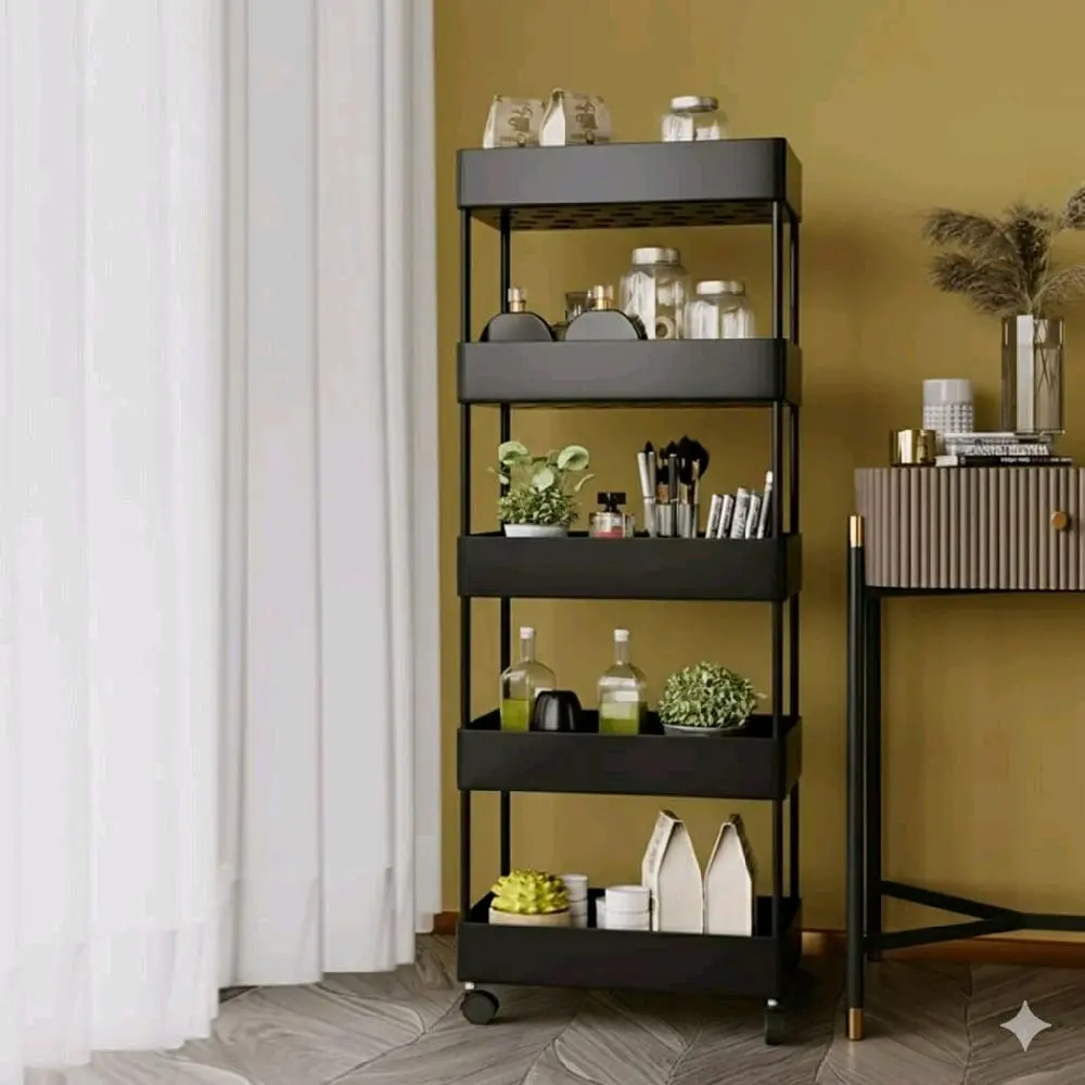 Modern Black 4-Layer Utility Cart - Penyimpanan Roda Hemat Ruang untuk Dapur/Rumah A22