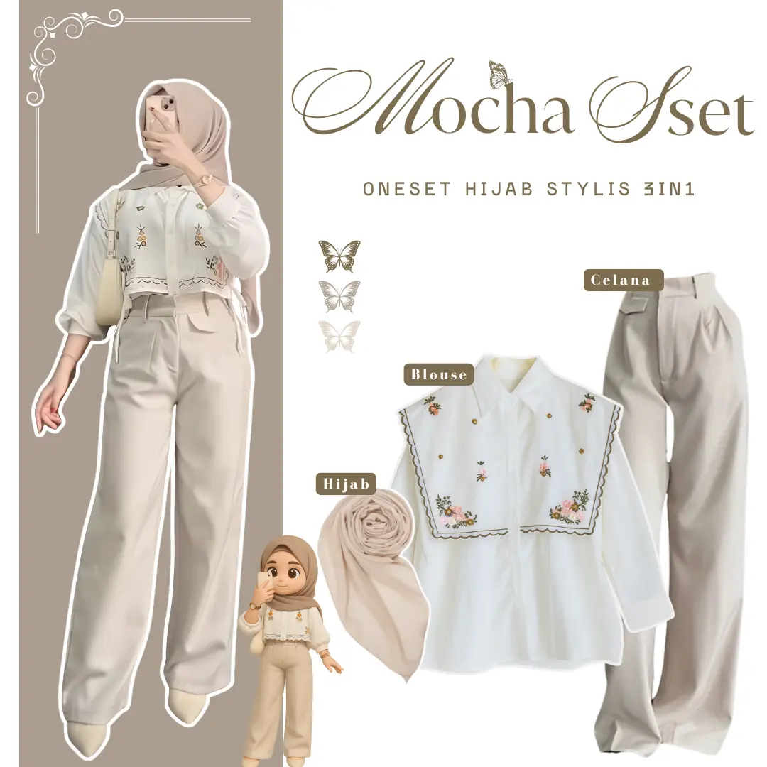 Set Mocha Outfit 3in1 - Blouse Nakeya Celana Oro Pants Hijab Segi Empat l One Set Hijab Stylish Look Soft & Elegant SO2A21