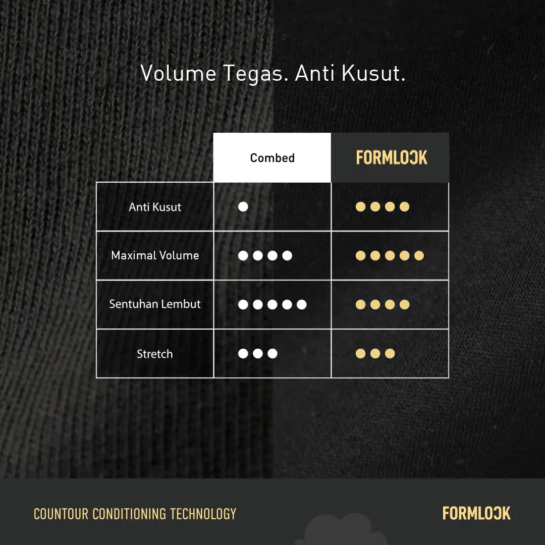 Material ini diformulasikan dengan CONTOUR CONDITIONING yang memberi siluet lebih bervolume, lebih terstruktur, dan lebih stylish tanpa perlu effort berlebih. Tinggalkan pakaian yang terlihat lemas dan tidak berbentuk, FORMLOCK menjaga bentuk ideal kalian sepanjang hari.