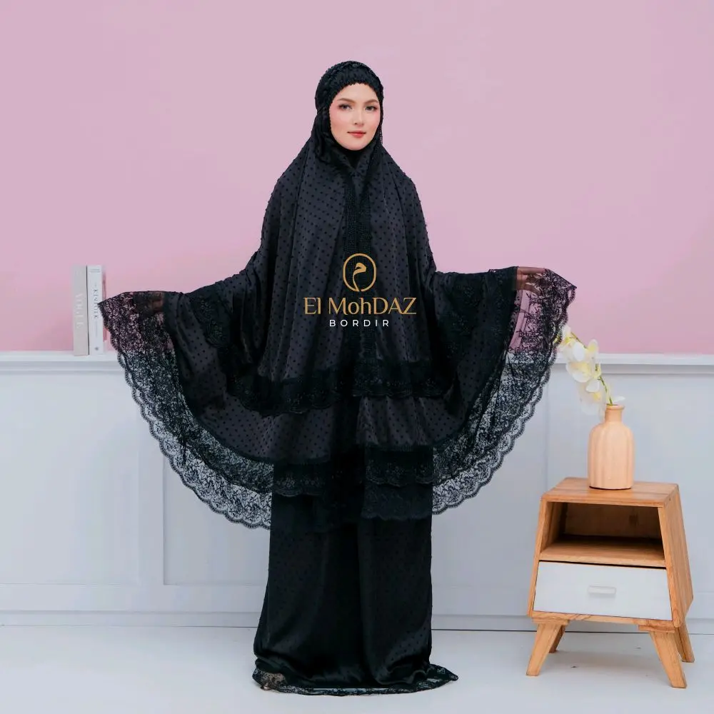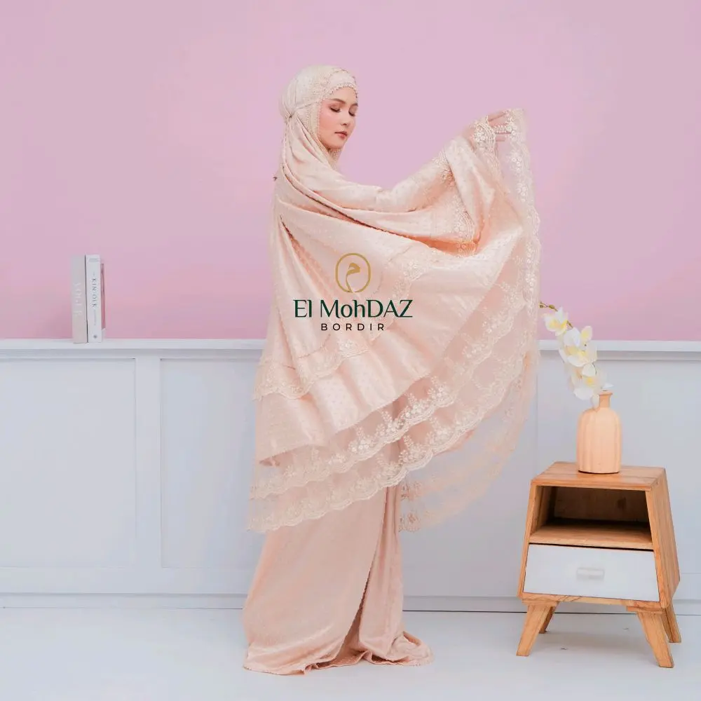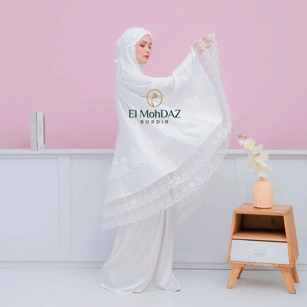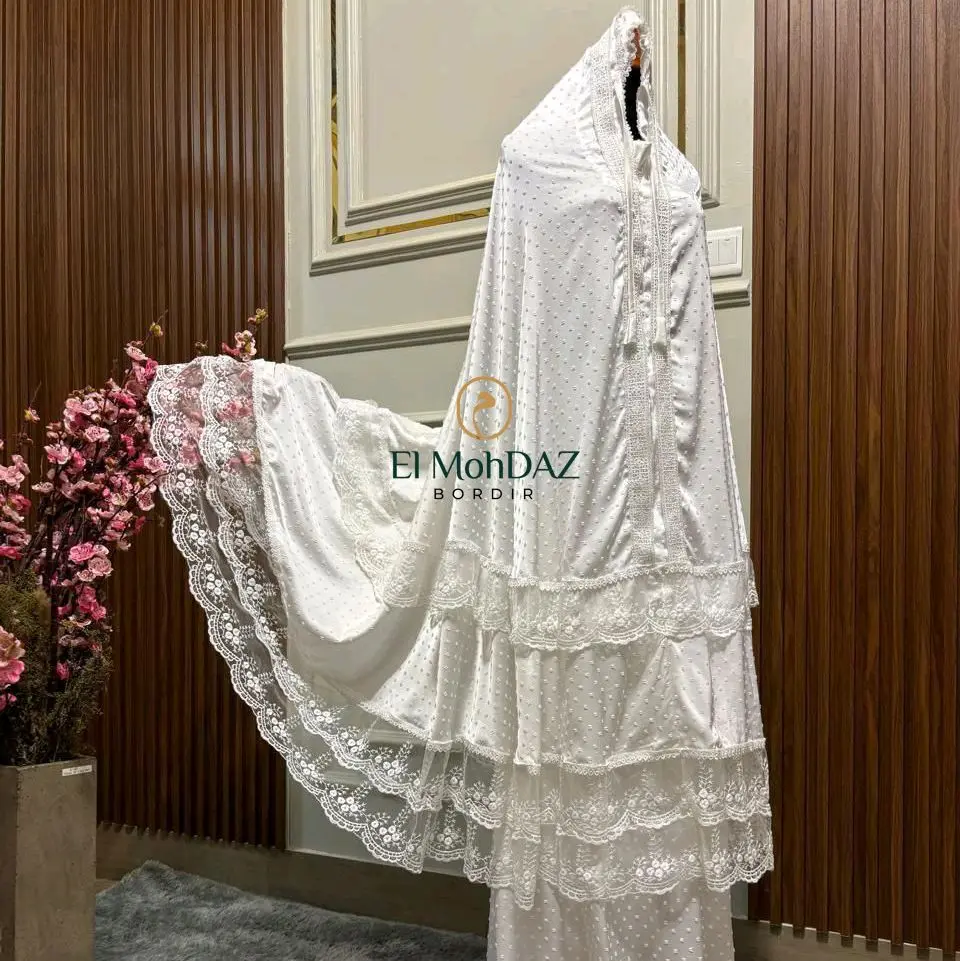 Mukena uragiri timbul dengan KD renda tule susun premium merupakan mukena dengan desain elegan yang memadukan keindahan detail dan kenyamanan bahan berkualitas tinggi.