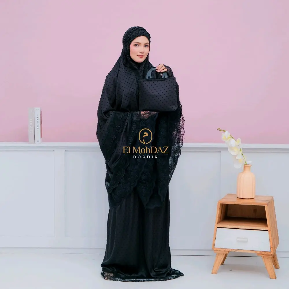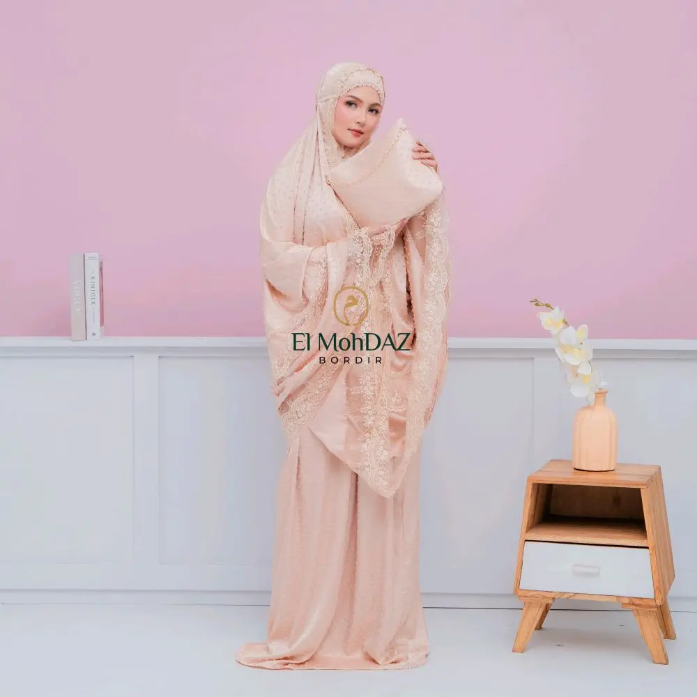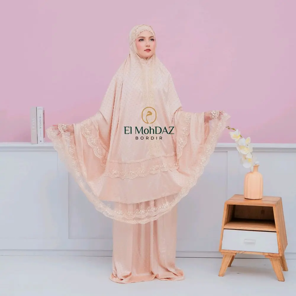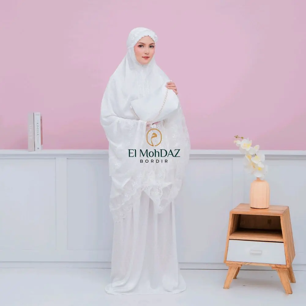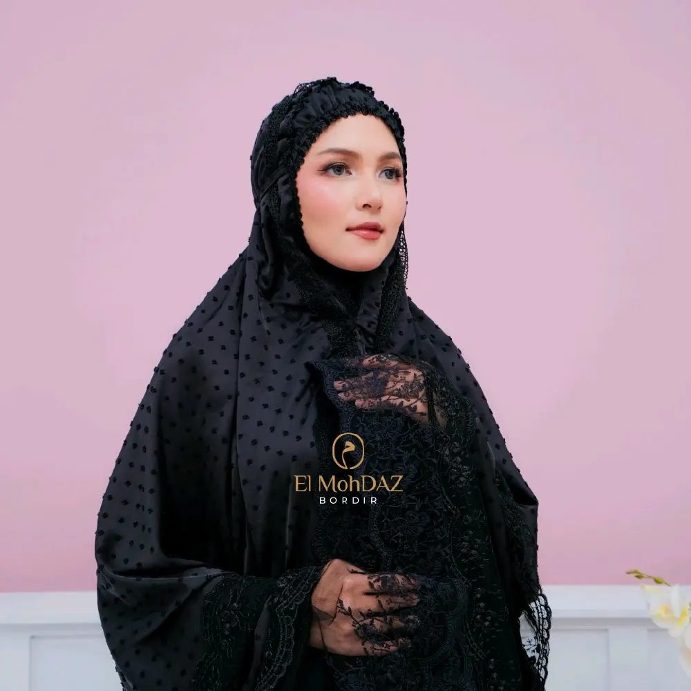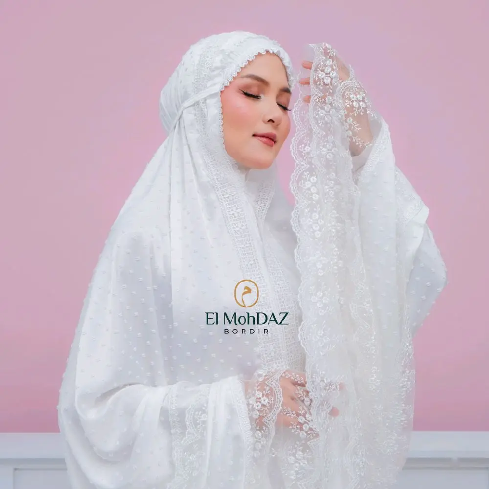 Terbuat dari bahan uragiri timbul original yang lembut, ringan, dan adem. Bagian muka dihiasi dwngan dengan renda ziper kecil memberikan kesan anggun tanpa berlebihan. Pada bagian bawah mukena, terdapat renda tule susun yang dipadukan renda ziper tambahan, menambah nilai estetika serta mempertegas kesan mewah dan eksklusif.