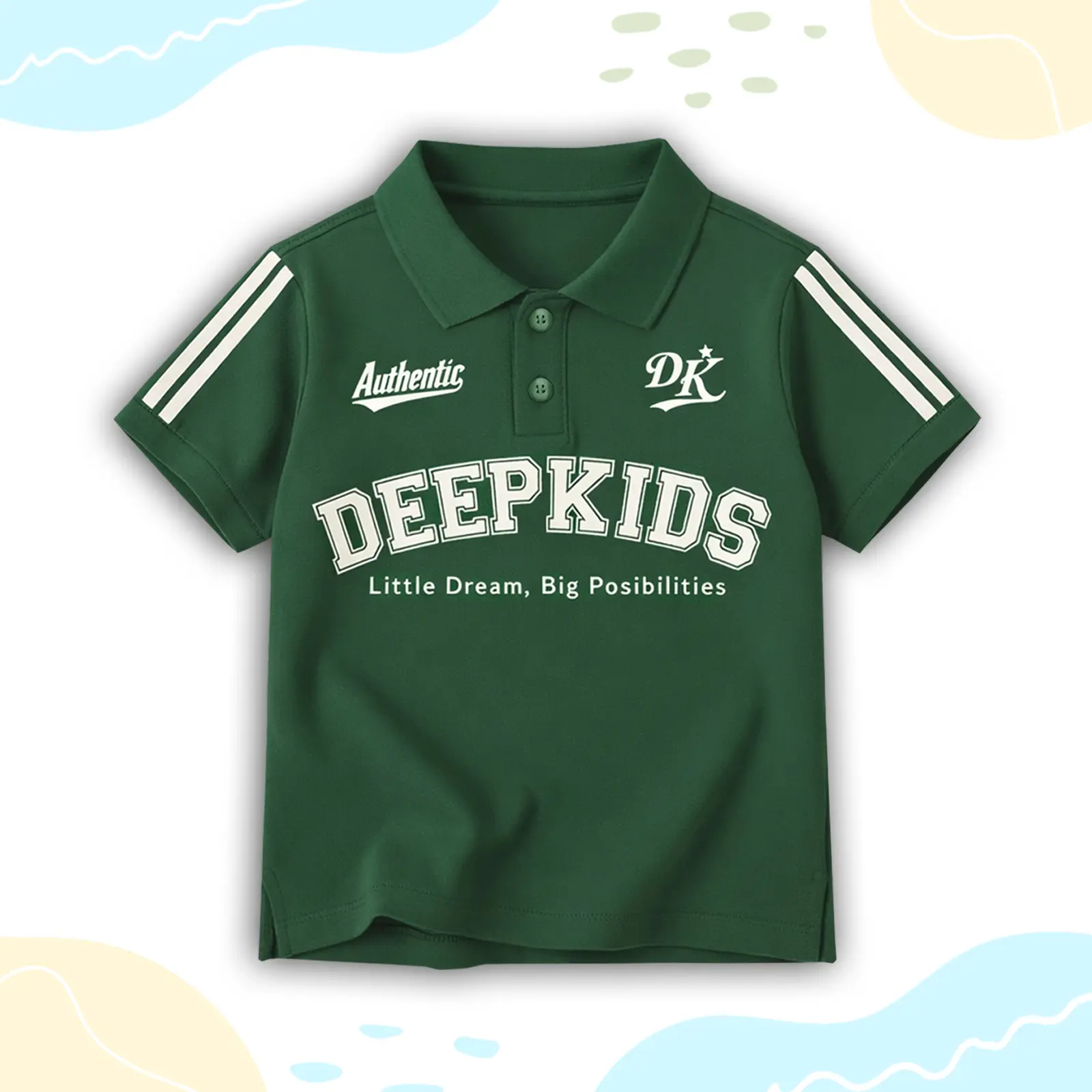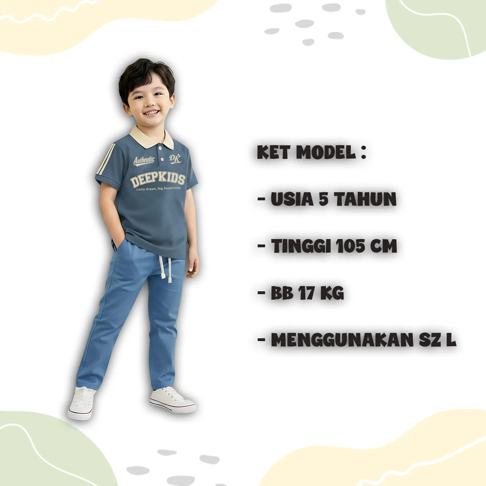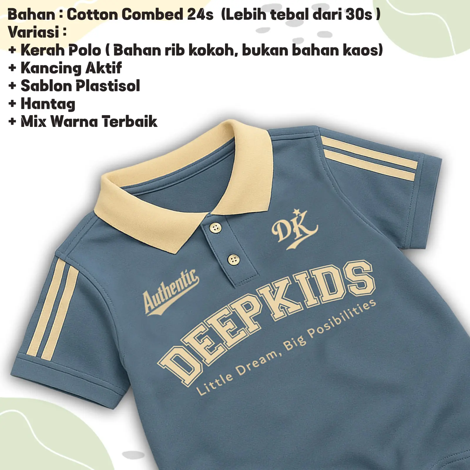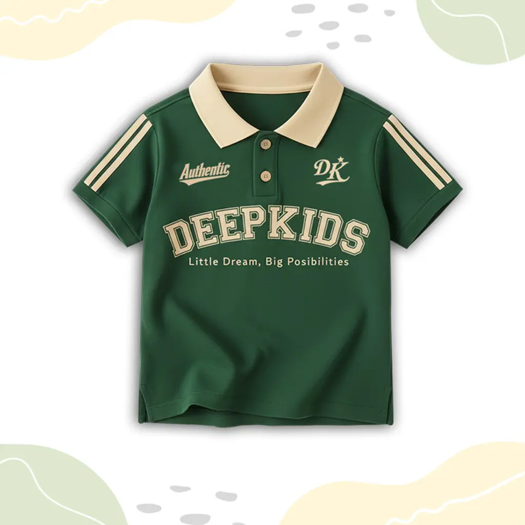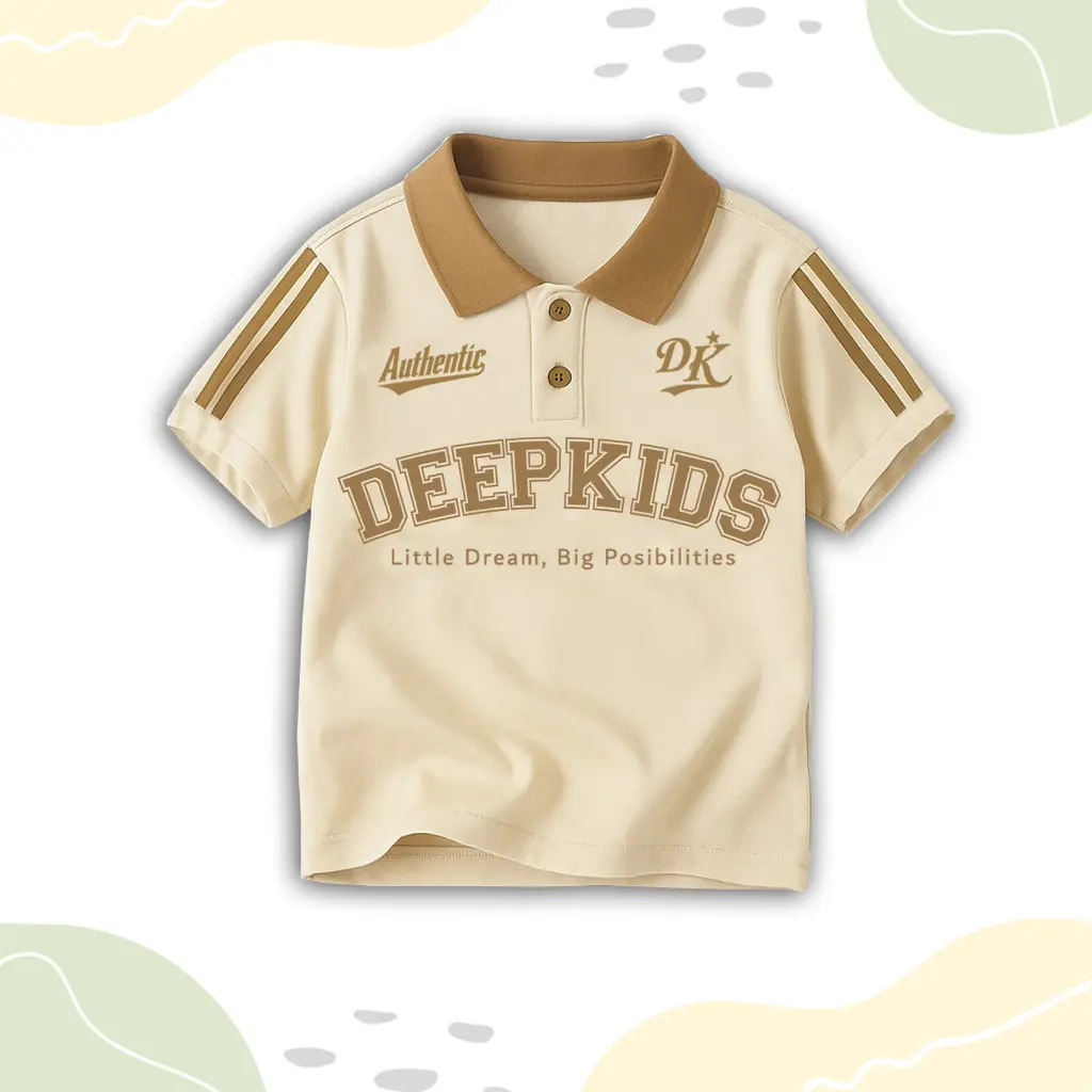 • Terdapat variasi: kerah polo bahan rib (bukan bahan kaos), kancing aktif, sablon plastisol, serta kombinasi desain dan warna menarik yang membuat anak tampil elegan saat memakainya.