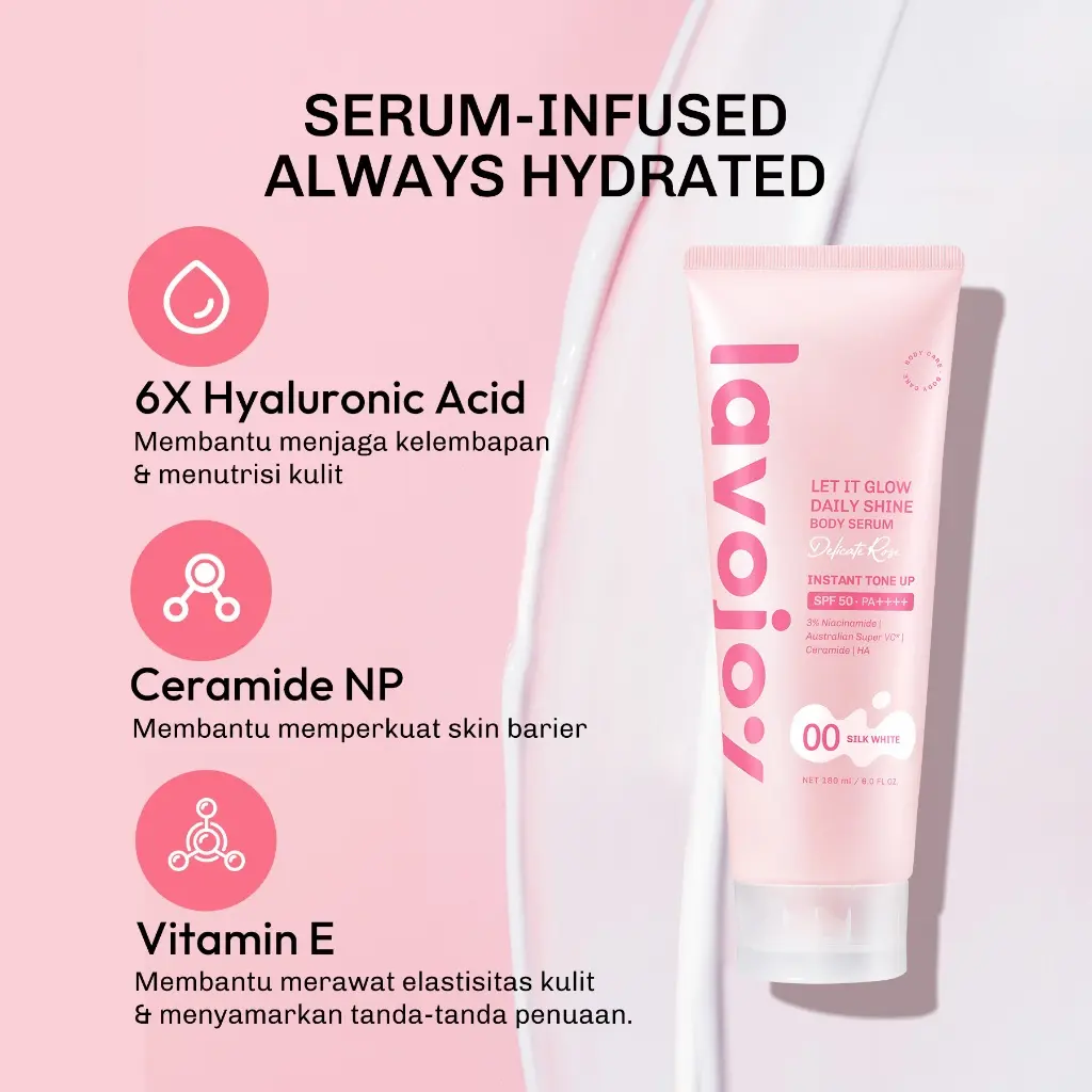 Body Serum dengan efek instan tone-up yang diperkaya dengan 3% Niacinamide, Australian Super Vitamin C*, Ceramide, dan Hyaluronic Acid untuk membantu mencerahkan, meratakan warna kulit, serta menjaga kelembapan agar kulit tetap sehat dan bercahaya. Dilengkapi dengan SPF 50 PA++++ untuk melindungi kulit dari efek buruk paparan sinar matahari.