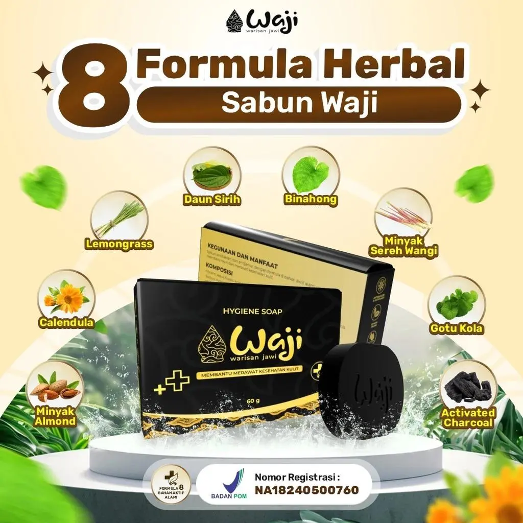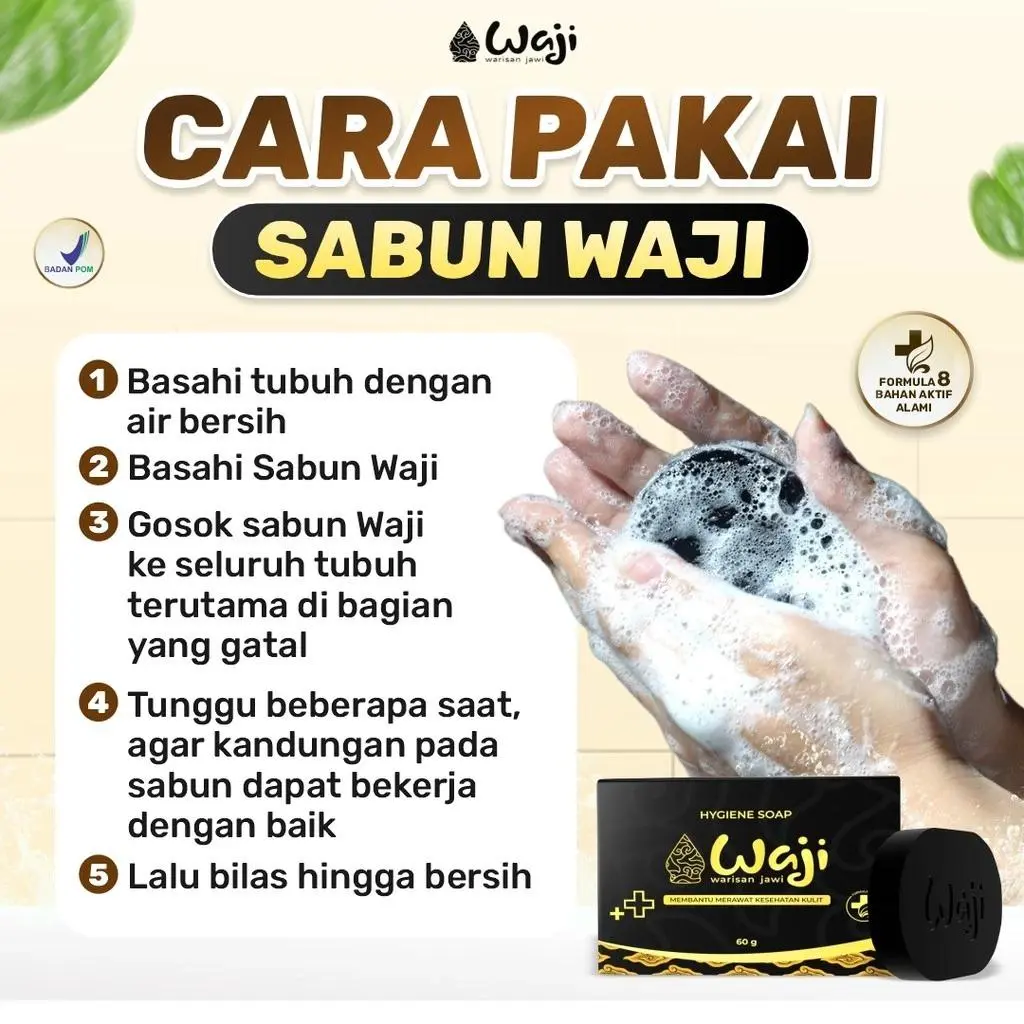 Sabun Waji menjadi sabun antibakteri dan antijamur dengan formula 8 Bahan Aktif Alami, Efektif membantu meredakan gatal, iritasi, biduran, eksim, scabies, jerawat punggung, dan panu, kadas, kurap, sekaligus memberikan perlindungan kulit agar tetap bersih, sehat, lembut, dan tidak kering.