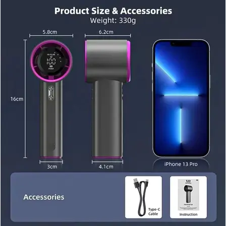 Kipas ini memiliki desain dua guna: handheld dan desktop. Cocok untuk perjalanan, kantor, belanja, dan berkemah. Kerangka aluminium ringan dengan lapisan logam halus. Baterai berkapasitas besar dengan antarmuka Type-C. Ukuran: 15 x 6,2 x 5,8 cm. Berat: 330 gram. Waktu Pengisian: 2,3 jam. Umur Baterai: 2-4 jam (100 gear), 10-14 jam (20 gear).
