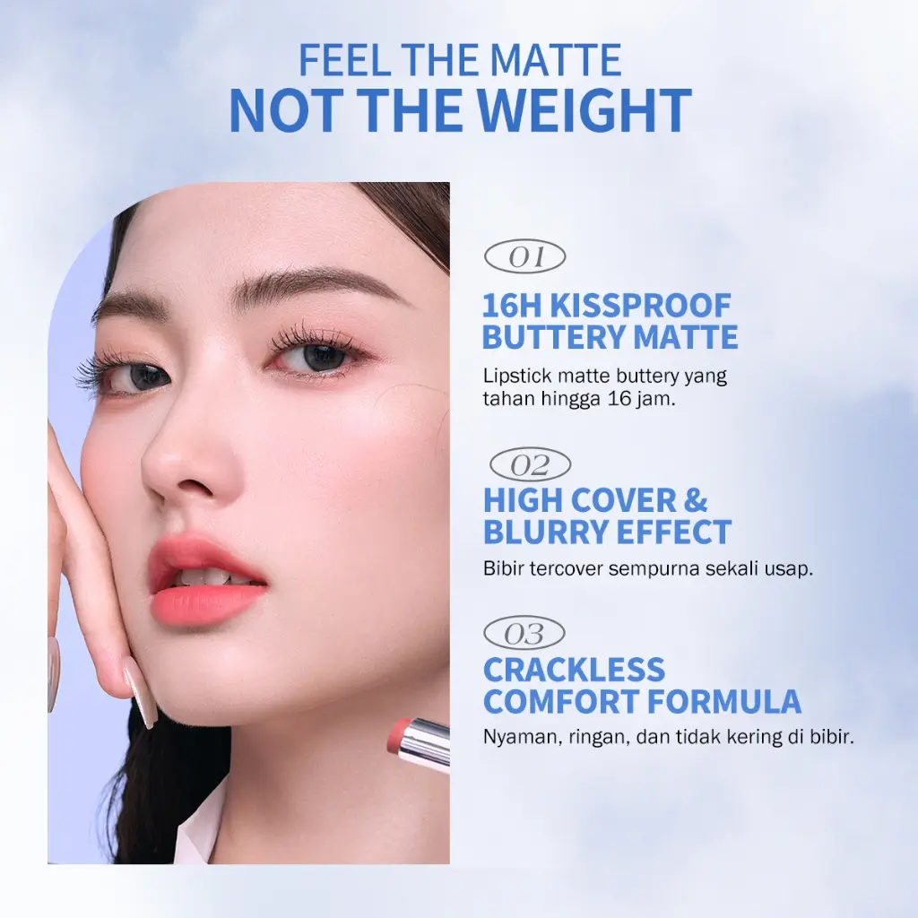 Mengandung kandungan alami seperti Calendula Oil, Sunflower Seed Oil, Shea Butter, Jojoba Seed Oil, Sodium Hyaluronate, and Squalane untuk menjaga bibir tetap lembap dari dalam ketika menggunakan lipstick matte