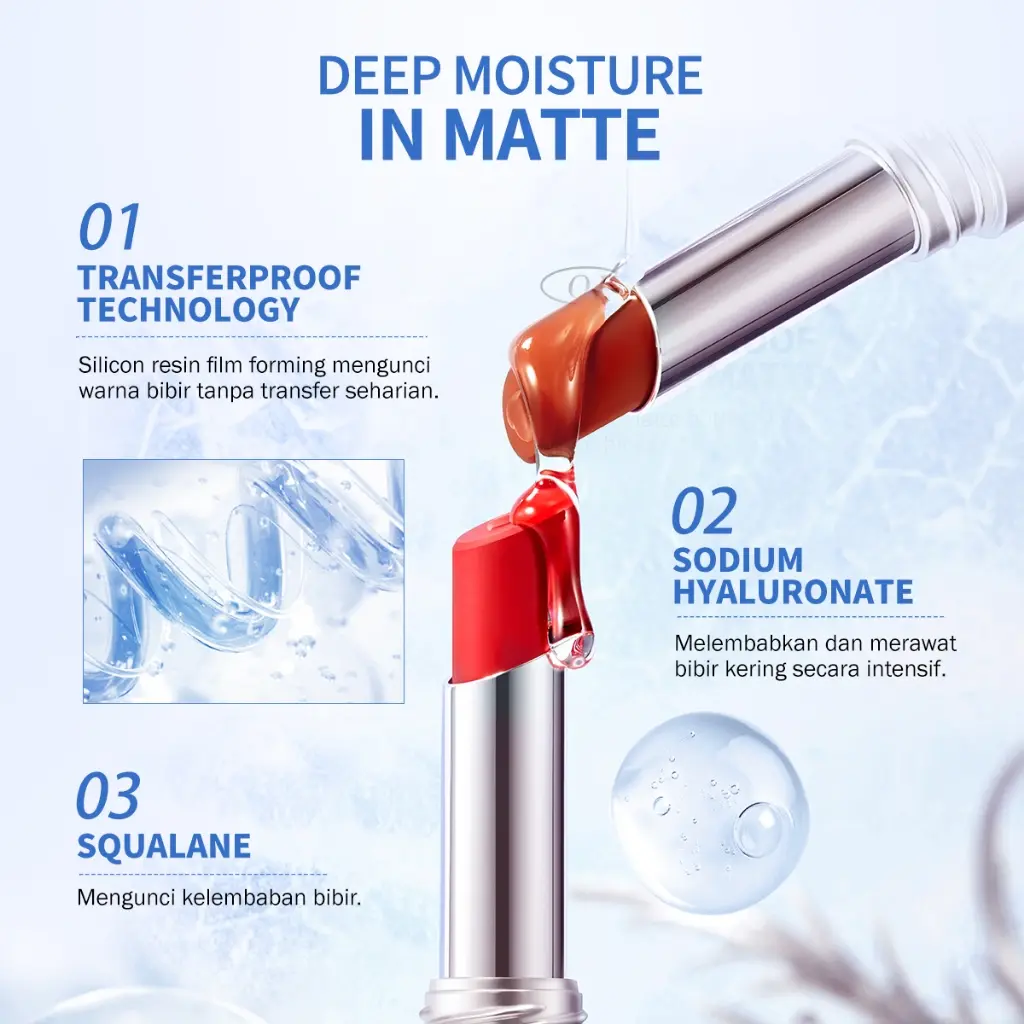 Teknologi silicone resin yang membentuk lapisan film untuk mengunci warna di bibir dan memberikan efek transferproof.