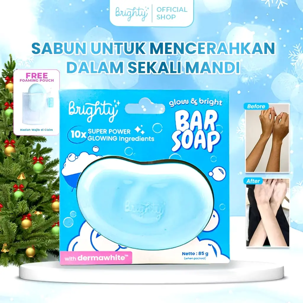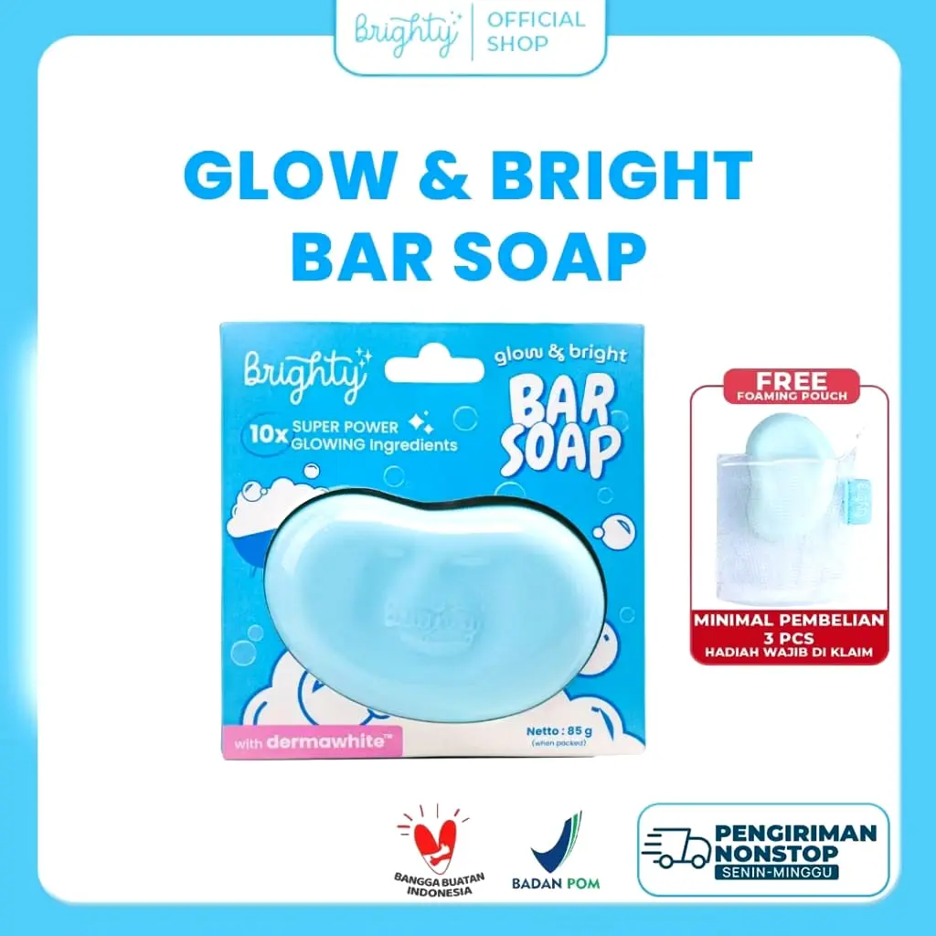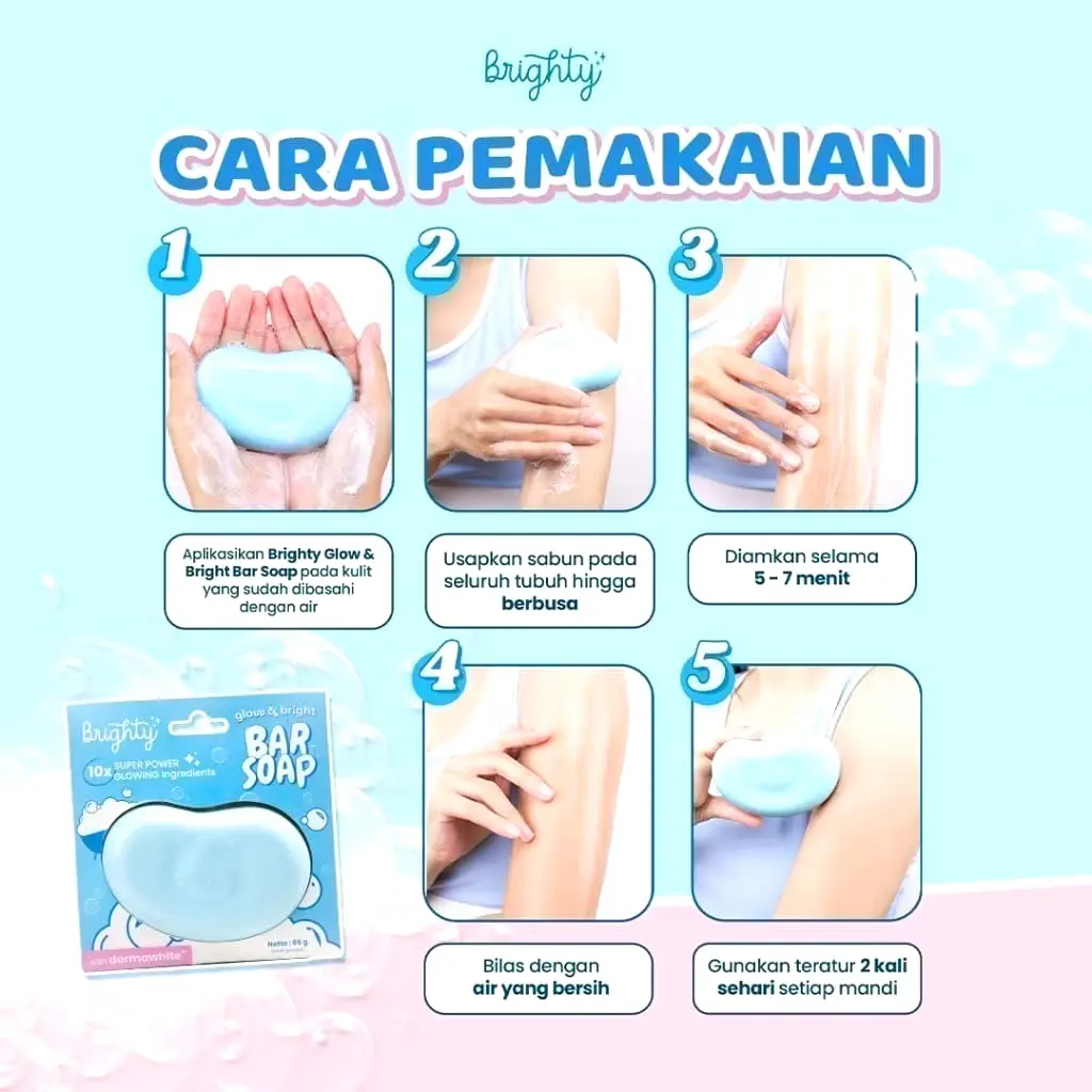 - Aplikasikan Brighty Glow & Bright Bar Soap pada kulit yang sudah dibasahi dengan air