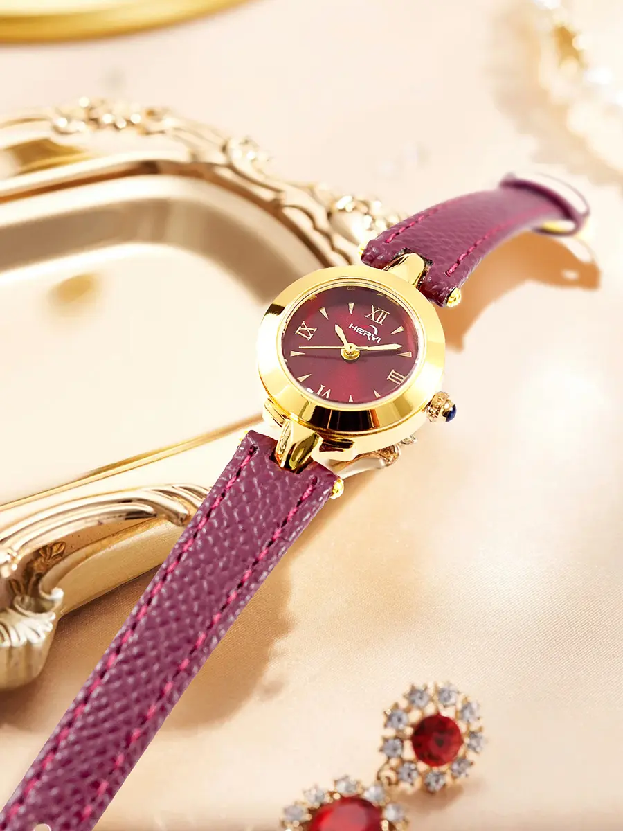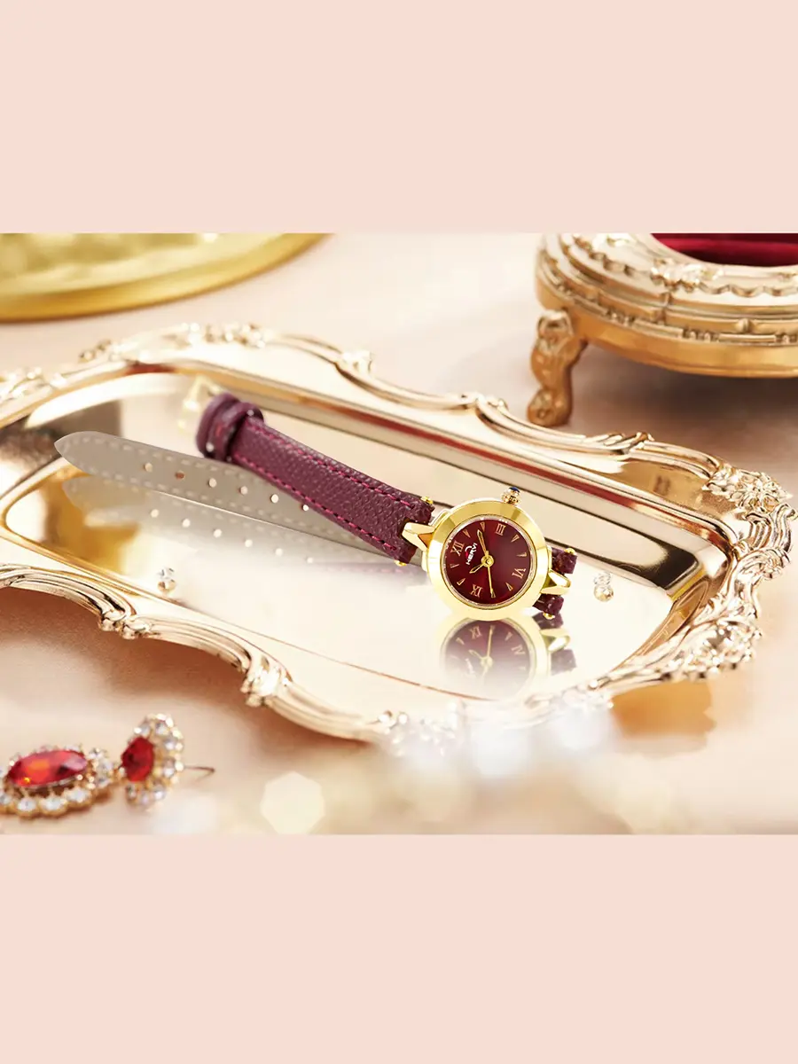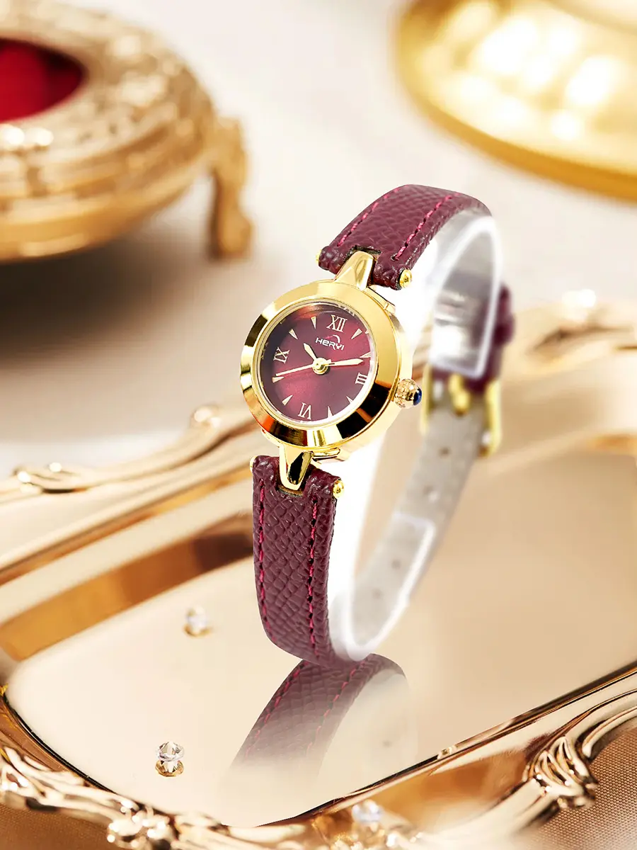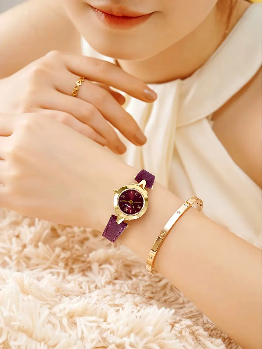 4311-Jam tangan berukuran kecil dan elegan, casing emas dengan dial hitam, tenang namun tetap mewah.