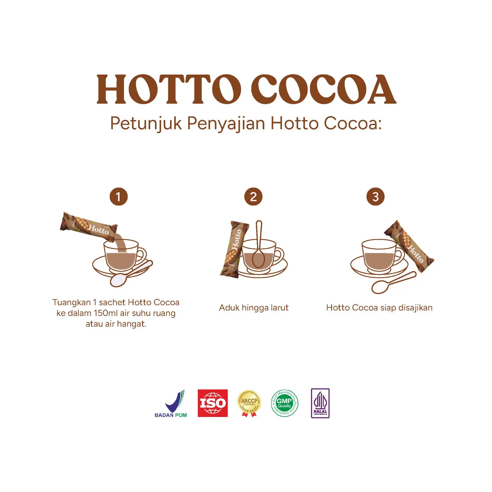 Tuang 1 sachet ke 150 ml air panas. Aduk hingga larut. Nikmati kelezatan cokelat sehat setiap hari!