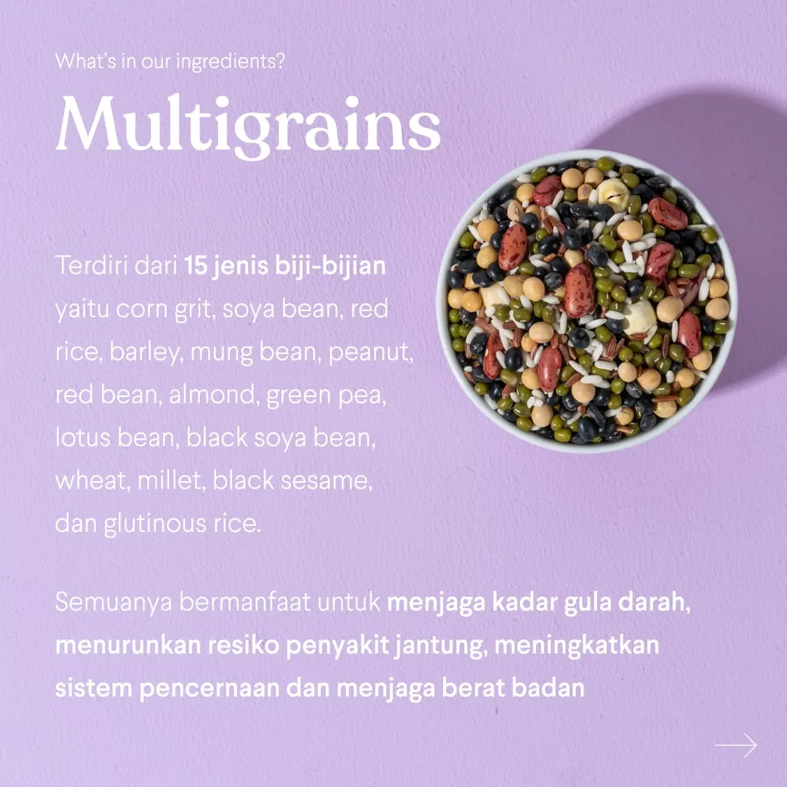 Nikmatnya cokelat, sehatnya biji-bijian! Minuman multigrain dengan cokelat premium yang tinggi serat (25% kebutuhan harian) dan rendah gula, cocok untuk kamu yang ingin tetap fit di tengah kesibukan.