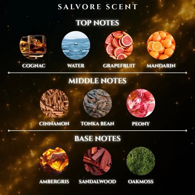 Parfum ini dibuka dengan perpaduan cognac boozy yang mewah, berpadu dengan segarnya grapefruit dan mandarin orange, serta nuansa water yang bersih. Aromanya bertransisi ke arah yang sedikit sweet dan halus dari cinnamon dan tonka bean, lalu disempurnakan dengan ringan dan kelembutan peony. Pada akhirnya, parfum ini berlabuh pada dasar ambergris yang mewah dan musky, sandalwood sebagai penyeimbang aroma dan oakmoss yang bersih dan earthy, memberikan kesan fresh, citrus dan ringan yang seimbang.