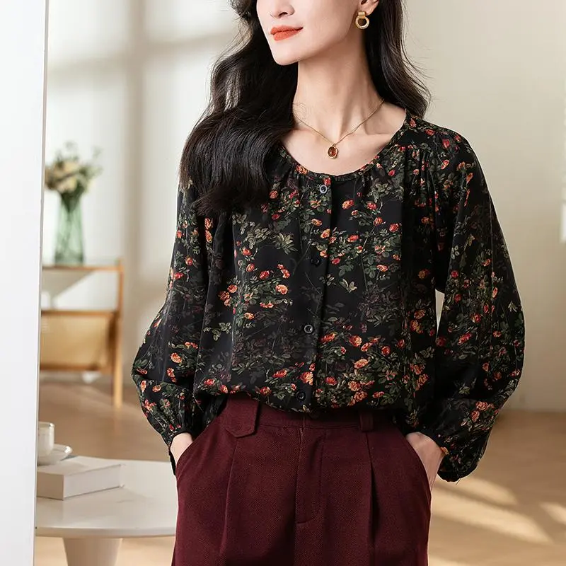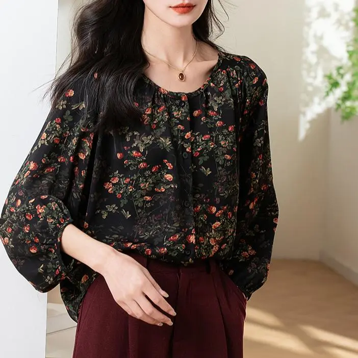 Vintage floral chiffon blouse, round neck, top, puff sleeves, loose fit, casual style, available up to 3XL