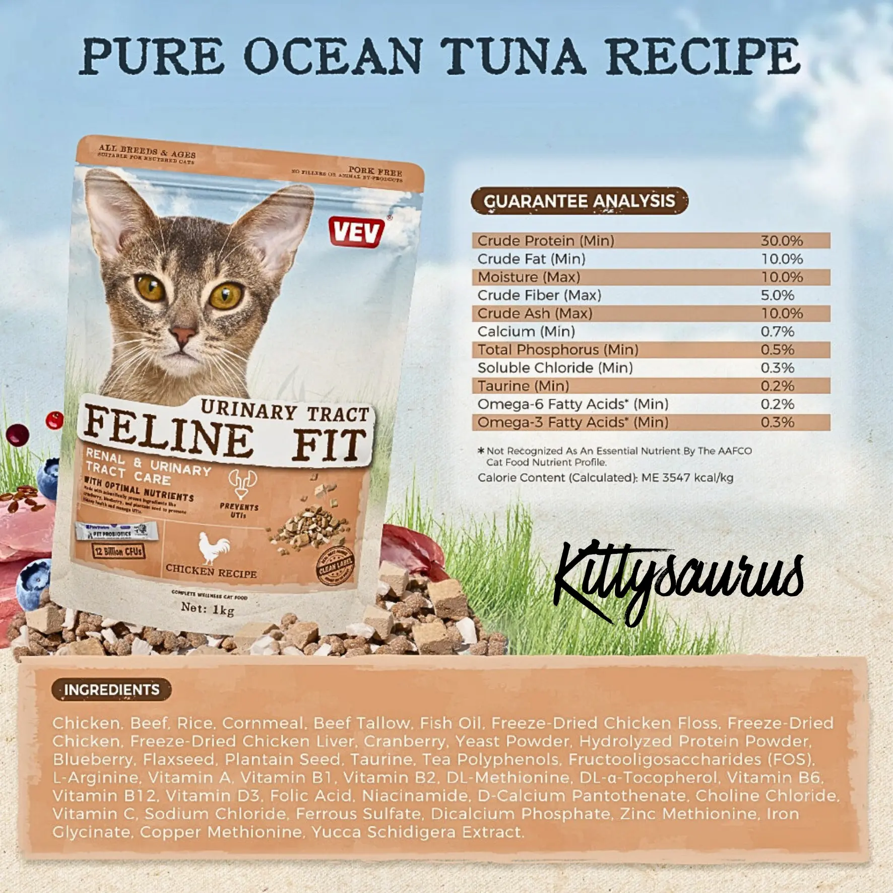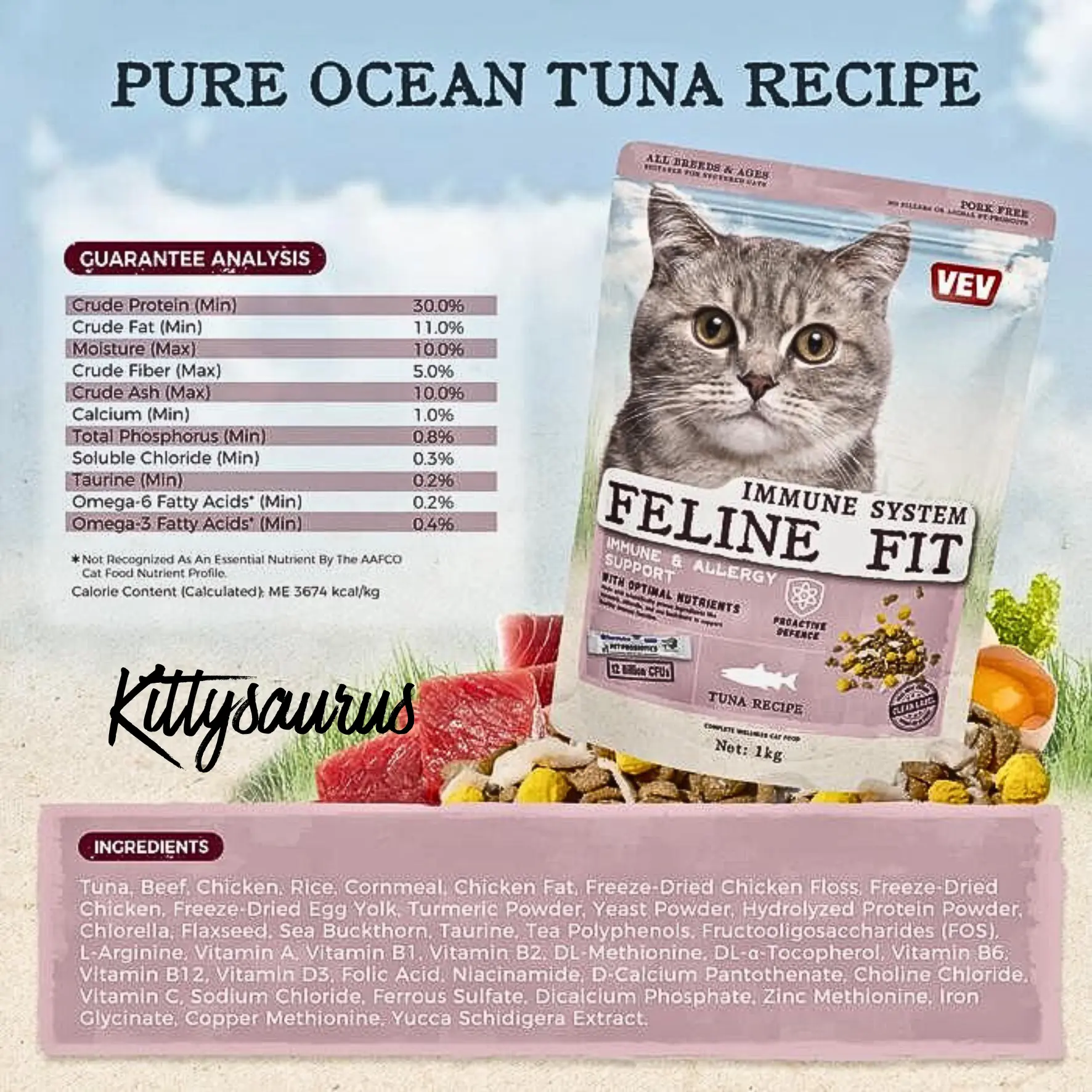 Ingredients & Nutrition: According to Pet Republic Indonesia, it contains chicken meal, brown rice, corn, corn gluten meal, chicken fat, natural flavors, and various vitamins and minerals, with a minimum of 34% crude protein and 14% crude fat. It is formulated to meet the nutritional levels established by the AAFCO Cat Food Nutrient Profiles for adult maintenance.