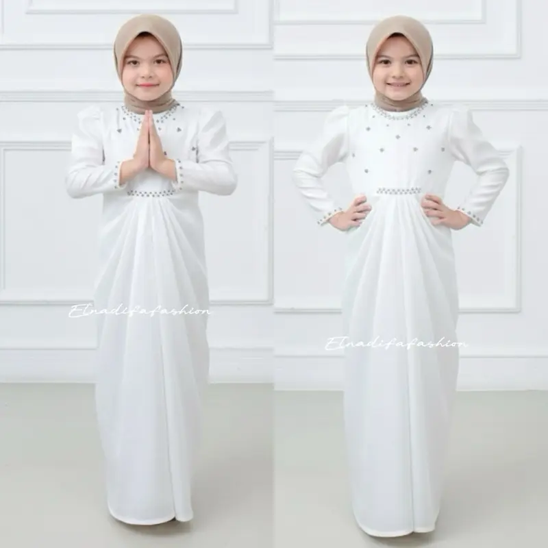 Elnadifa Fashion Kaftan Anak Baju Lebaran 2026 Kekinian Simple Dan Elegant Bahan Satin Lembut Dingin Tidak Menerawang Payet Mutiara Kerajinan Tangan