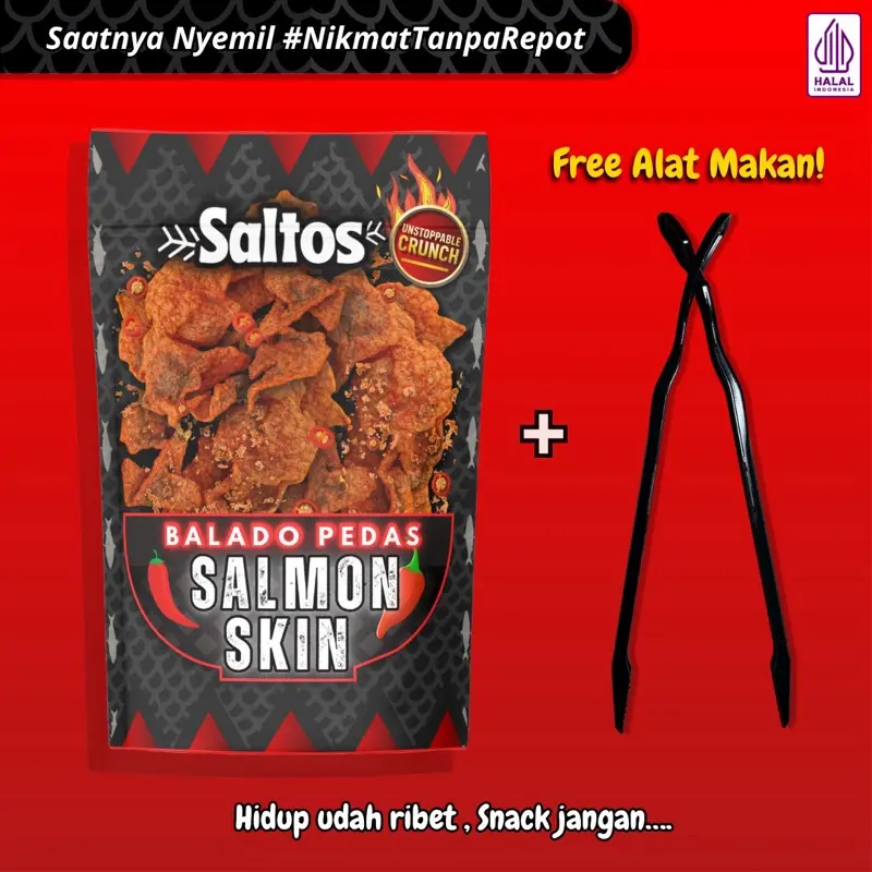 Saltos adalah camilan kulit ikan salmon pilihan, digoreng hingga super kriuk, lalu dibalur dengan Bumbu balado pedas dengan aroma bawang yang khas balado !