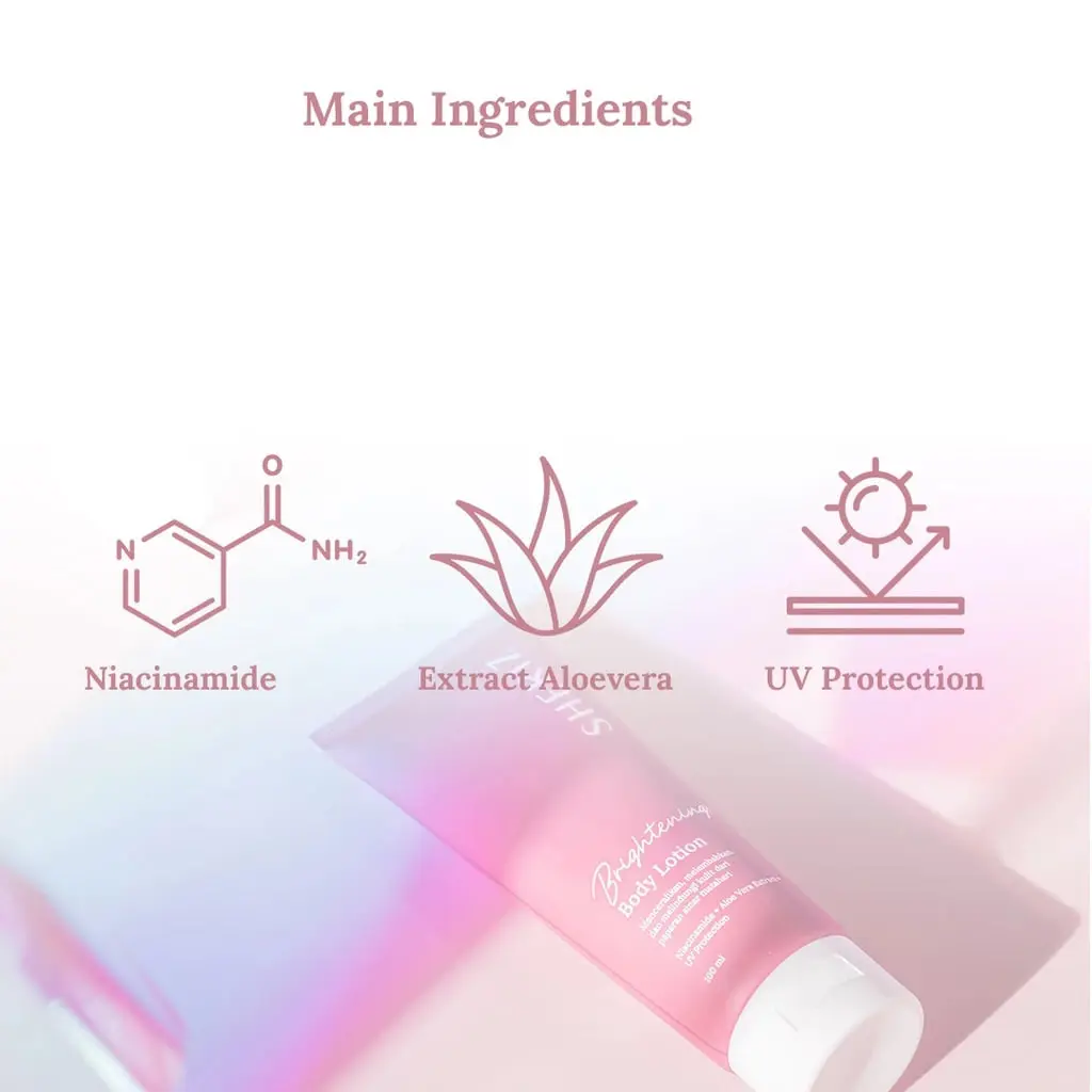 Sheriz brightening body lotion memiliki formula dengan kandungan niacinamide bermanfaat membantu mencerahkan dan meratakan warna kulit yang tidak rata. Terdapat kandungan UV Protection untuk melindungi kulit dari paparan sinar matahari serta terdapat kandungan extract Aloevera bermanfaat melembabkan kulit.