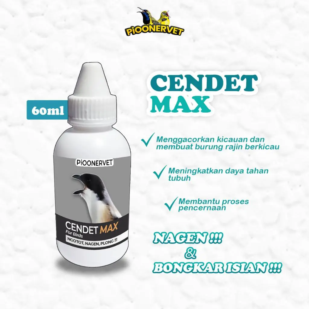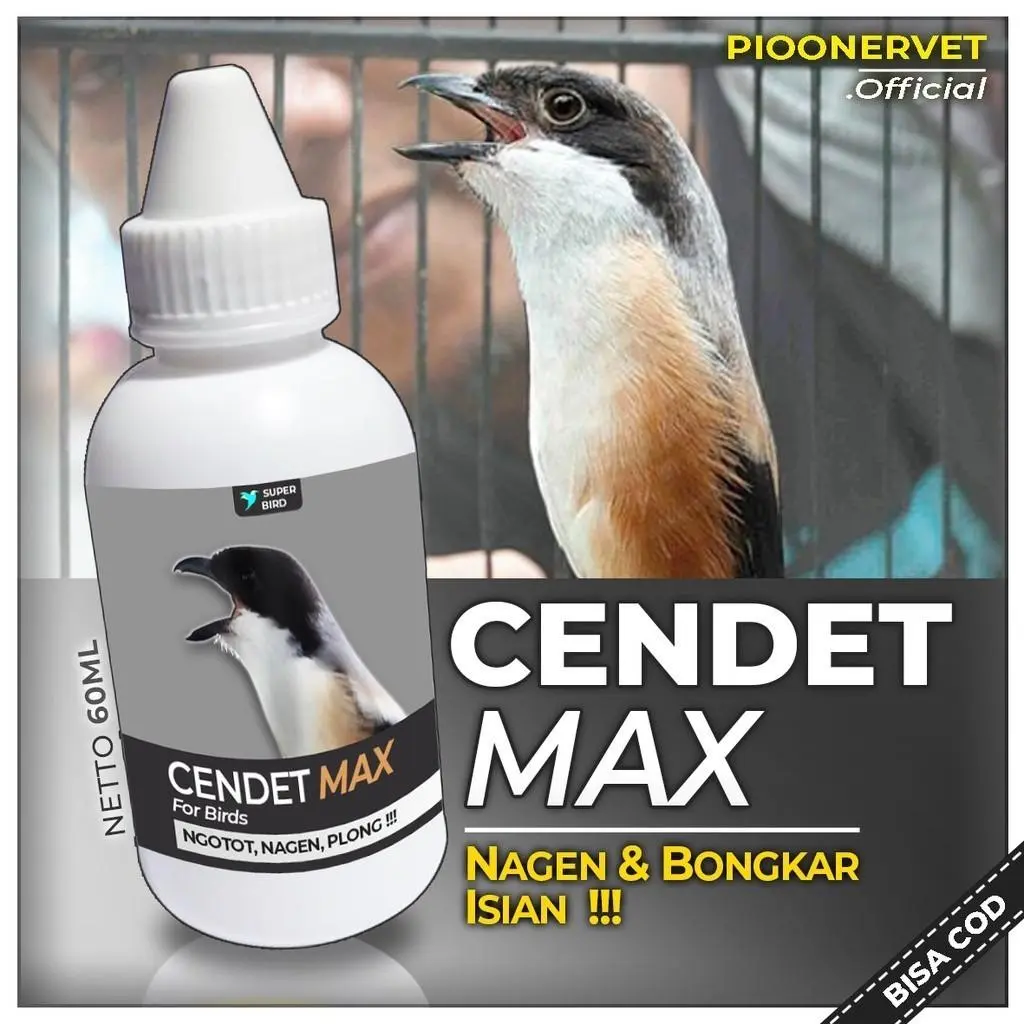 CENDET MAX merupakan vitamin khusus burung Cendet yang memiliki berbagai khasiat seperti merangsang Cendet untuk berkicau, ngotot, nagen, memperpanjang durasi kicau, suara lebih plong, meningkatkan kesehatan, dll.