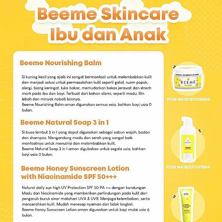 š—šš—„š—”š—§š—œš—¦ š—›š—”š——š—œš—”š—›| š— š—œš—§š—„š—” š—„š—˜š—¦š— š—œ š—•š—˜š—˜š— š—˜| š—žš—œš—„š—œš—  š—–š—˜š—£š—”š—§| š—£š—˜š—”š—šš—œš—„š—œš— š—”š—” š—¦š—˜š—”š—œš—” - š— š—œš—”š—šš—šš—Ø ------------------------------------------------- BeeMeĀ skincareĀ halalĀ dapatĀ digunakanĀ untukĀ :Ā  -Ā BayiĀ baruĀ lahirĀ (Newborn) -Ā RemajaĀ (Teenager) -Ā IbuĀ HamilĀ &Ā MenyusuiĀ  BerfungsiĀ mengatasiĀ segalaĀ permasalahanĀ kulit.Ā KandunganĀ bahannyaĀ 100%Ā FoodĀ GradeĀ danĀ OrganicĀ sehinggaĀ jikaĀ tidakĀ sengajaĀ tertelanĀ tetapĀ aman. DalamĀ sepaketĀ terdiriĀ 3Ā produkĀ : Ā BeemeĀ NourishingĀ BalmĀ 15gr POMĀ NA18191306866 LPPOMĀ MUIĀ -Ā 00150100251119 Ā BeemeĀ HoneyĀ SunscreenĀ SPF50Ā PA+++Ā WithĀ NiacinamideĀ 25gr POMĀ NA18210107745 Ā BeemeĀ SoapĀ 3in1Ā HoneyĀ &Ā SerehĀ 100ml POMĀ NA18201201964 LPPOMĀ MUIĀ -Ā 00150100251119 LebihĀ hematĀ beliĀ langsungĀ sepaketĀ begini. ApalagiĀ jikaĀ beliĀ diĀ FLYVE.COĀ karenaĀ barangĀ langsungĀ dikirimĀ +Ā FREEĀ GIFTĀ lohĀ :D