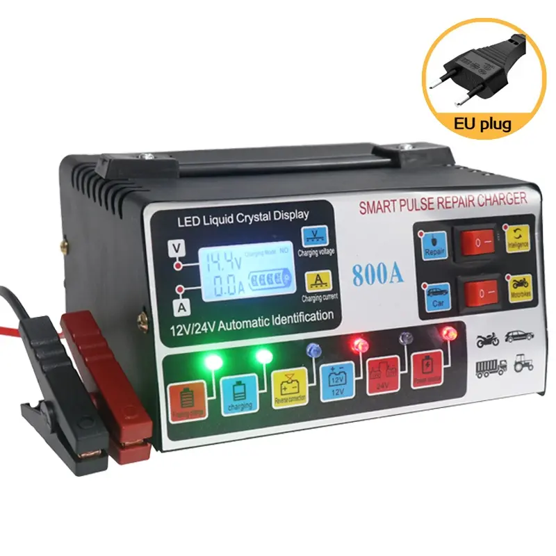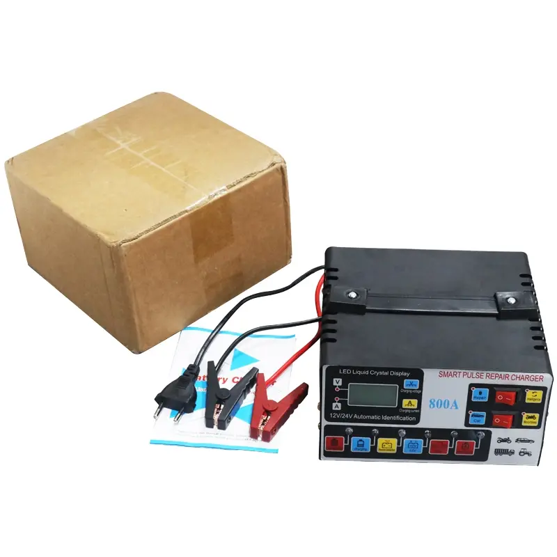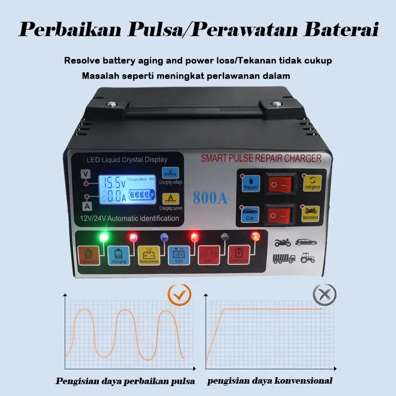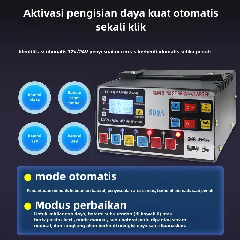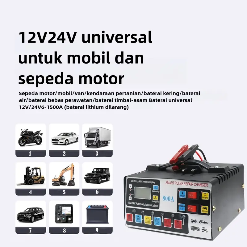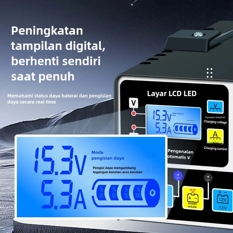 Charger aki dengan daya 12V/24V. Charger aki ini memiliki layar LCD yang berguna untuk menampilkan informasi voltase. Dapat digunakan untuk mengisi aki pada mobil, motor, truck, kapal dan kendaraan lainnya.(Colokan telah diganti dengan standar Eropa)