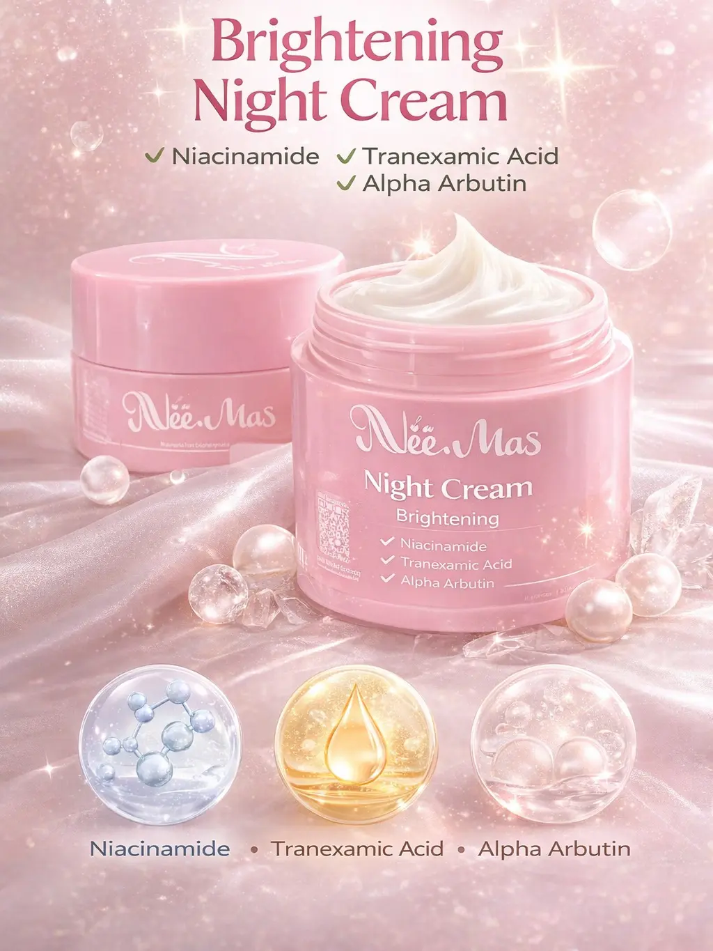 Hai, sudah mencoba produk skincare yang aman dan efektif? Yuk, kenalan dengan Nee.Mas Night Cream Brightening skin. Diperkaya dengan Niacinamide, Tranexamic Acid, dan Alpha Arbutin. Niacinamide cerahkan dan meratakan warna kulit. Tranexamic Acid memudarkan bekas jerawat dan memperkuat skin barier. Alpha Arbutin menjaga kelembaban kulit dan melindungi dari radikal bebas.