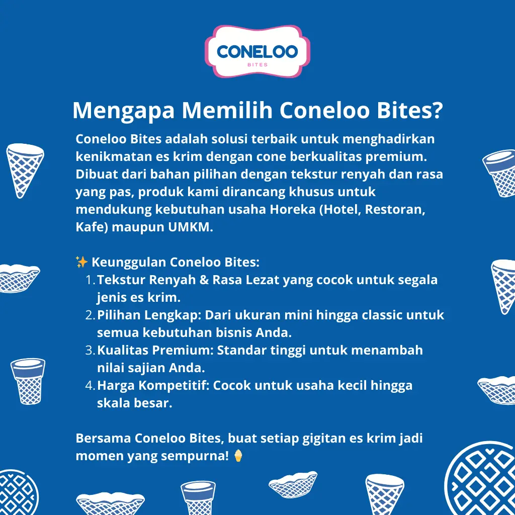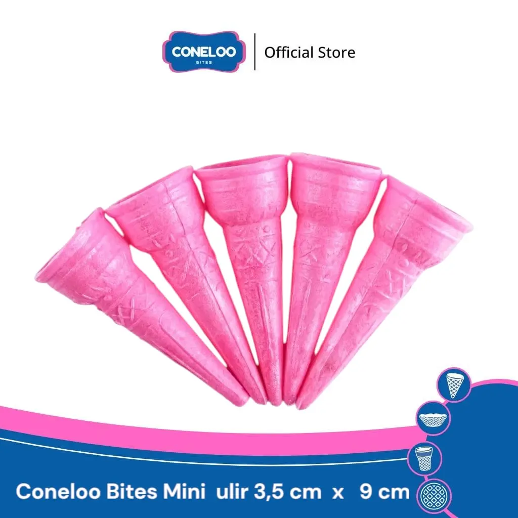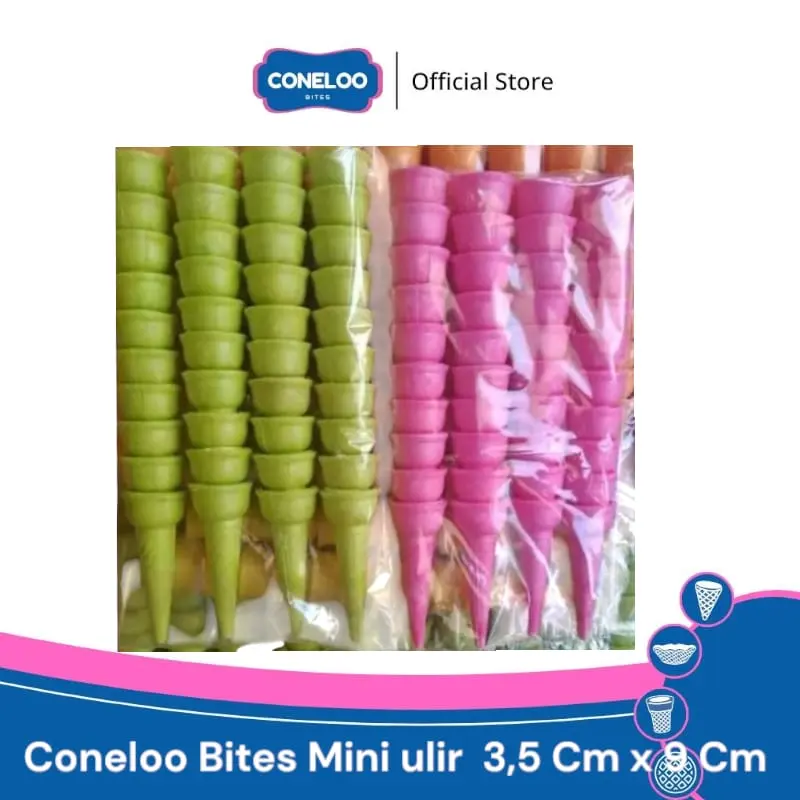 Coneloo Bites Mini Cone Waffle hadir untuk melengkapi sajian es krim Anda dengan ukuran yang praktis dan tekstur renyah sempurna. Dengan diameter 2,5 cm dan tinggi 7 cm, cone ini dirancang khusus untuk porsi kecil yang pas, cocok untuk dessert unik, tester, atau menu kreatif lainnya.