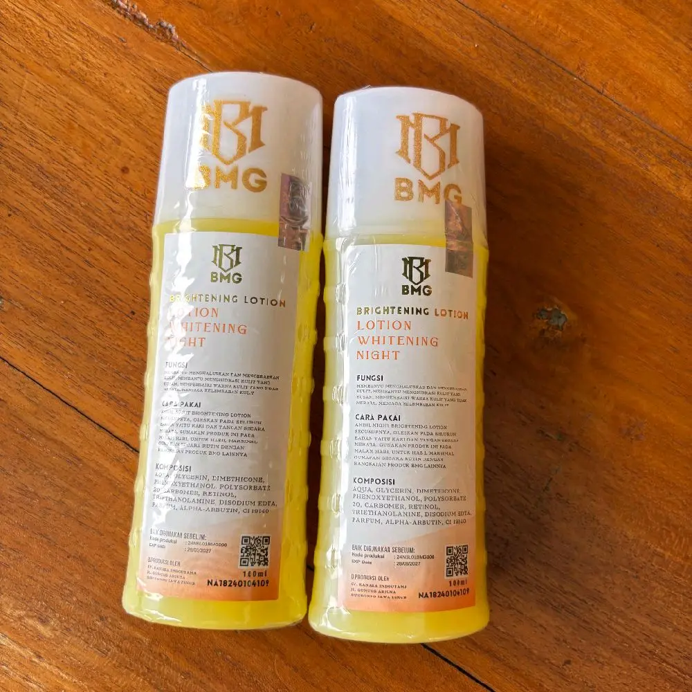 ยทKeuntungan: Dengan paket ini, Anda akan mendapatkan dua botol night lotion brightening BMG. Tersedia stok dan siap untuk digunakan. Jangan lewatkan penawaran ini! ๐Ÿ›๏ธ