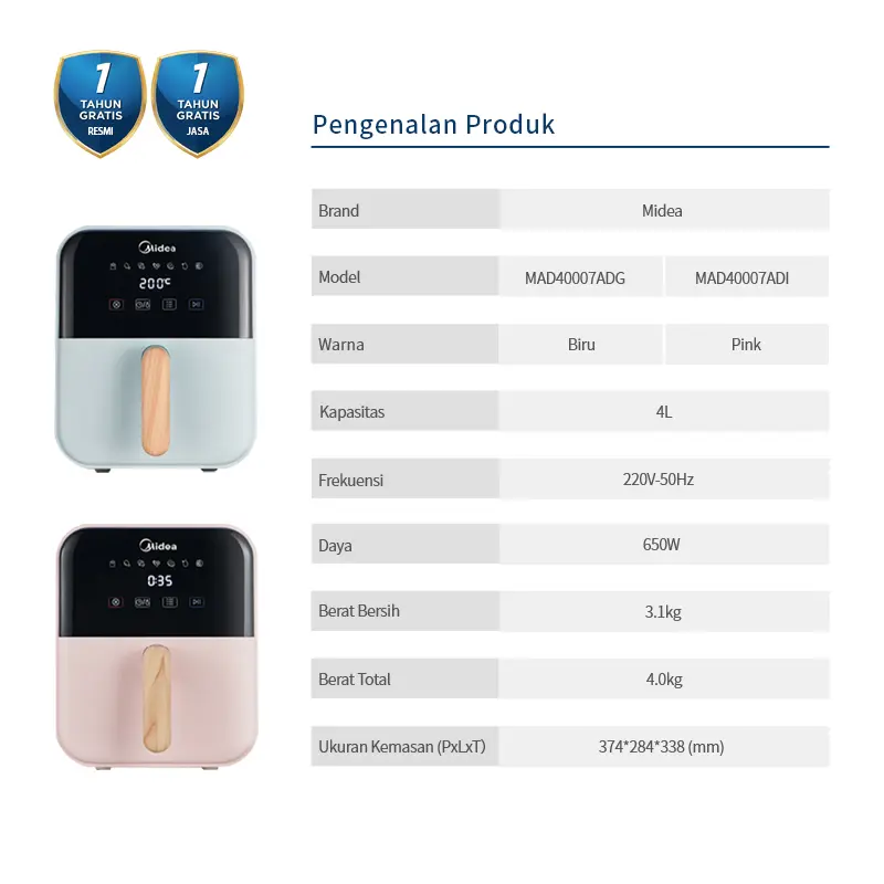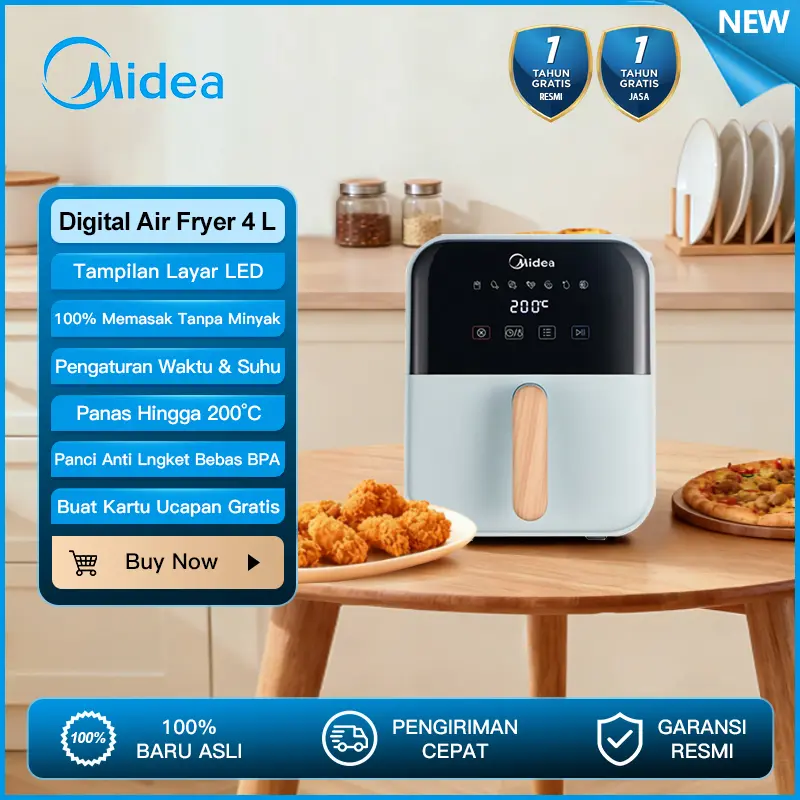 Midea Air Fryer MAD40007ADI dilengkapi dengan berbagai fitur unggulan yang membuatnya menjadi alat dapur multifungsi yang sempurna. Teknologi tanpa minyak memastikan bahwa makanan tetap lezat dan sehat, sementara kapasitas 4 liter memungkinkan Anda untuk memasak berbagai jenis hidangan sekaligus. Dengan daya 650W, alat ini hemat listrik dan cocok untuk penggunaan sehari-hari. Digital touch control memudahkan Anda dalam mengatur suhu dan waktu memasak dengan presisi tinggi. Sistem panas 360° memastikan bahwa makanan matang merata dari segala arah, sehingga Anda tidak perlu repot membolak-balik makanan. Keranjang anti lengket yang terbuat dari bahan food grade dan bebas BPA membuatnya mudah dibersihkan dan aman untuk digunakan. Desainnya yang modern dan kompak juga menambah estetika dapur Anda.