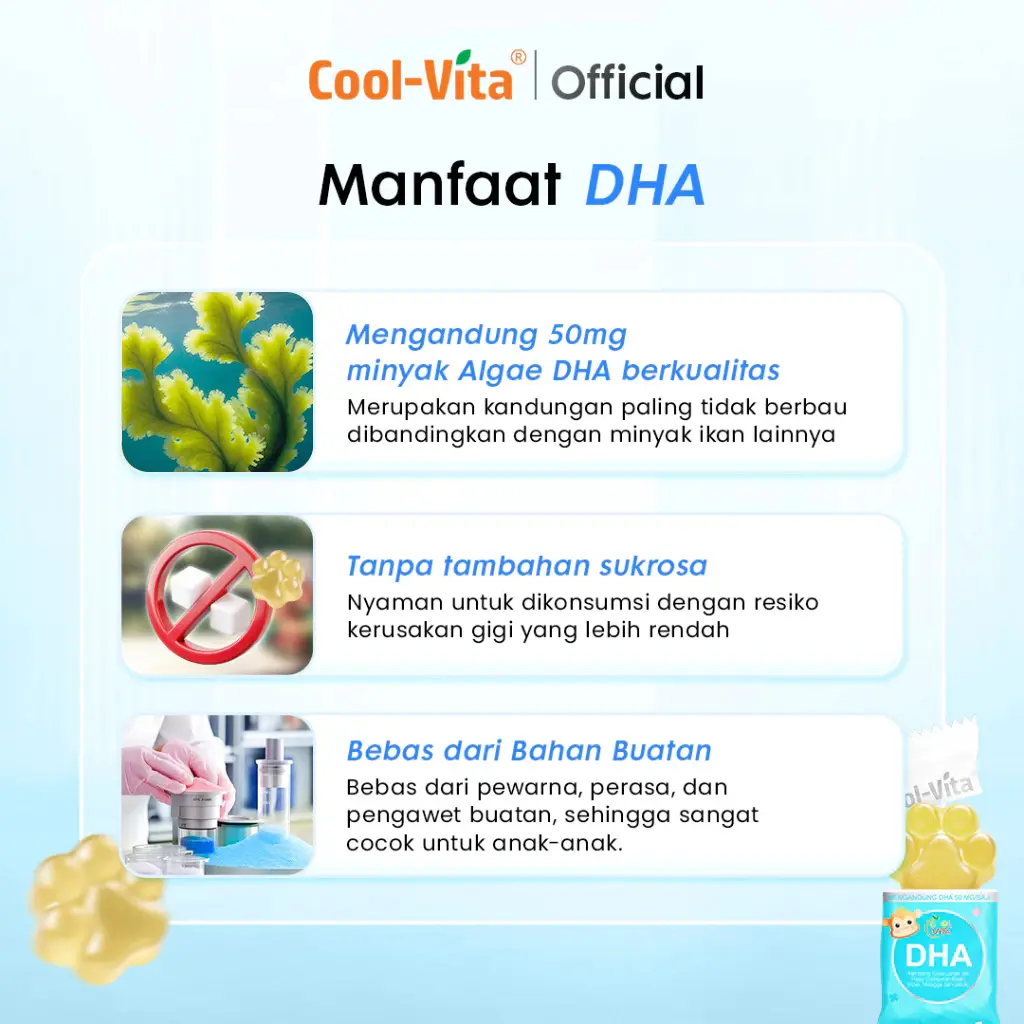 Cool-Vita DHA Gummy bukan hanya sekedar produk yang memiliki DHA berkualitas tinggi, tetapi juga merupakan gummy sehat rendah gula dan menggunakan pengganti pemanis yang sehat, sehingga lebih aman untuk asupan anak-anak