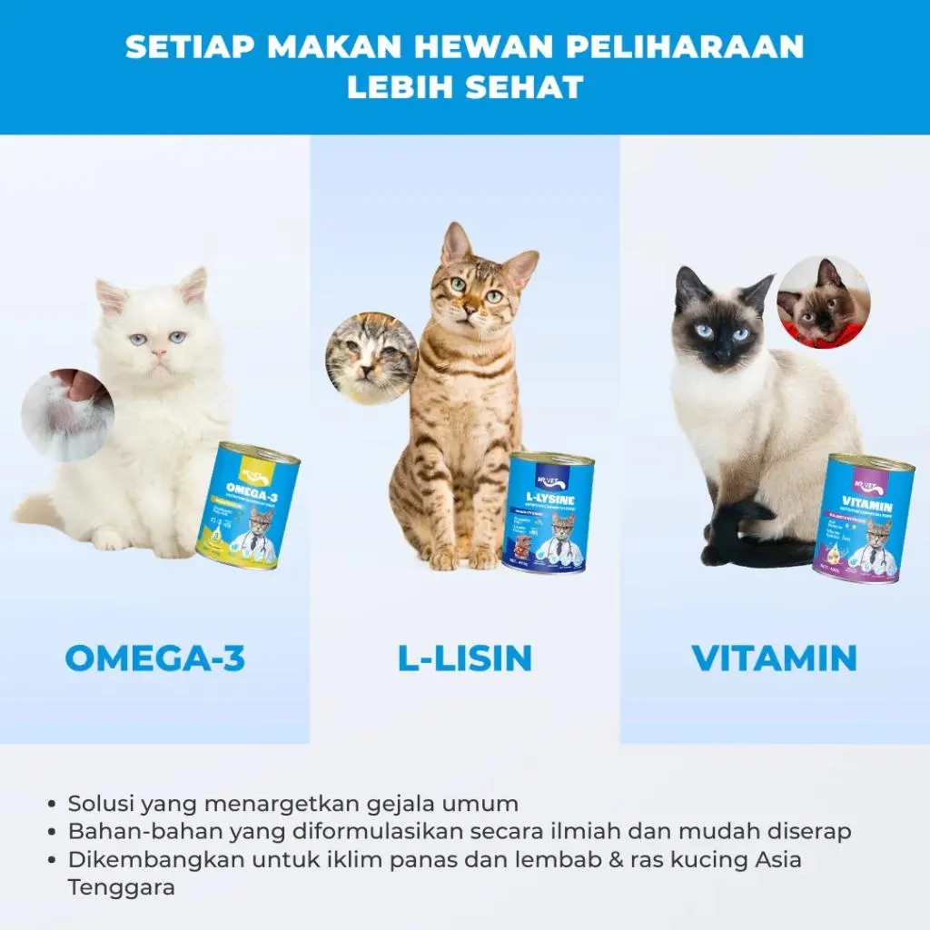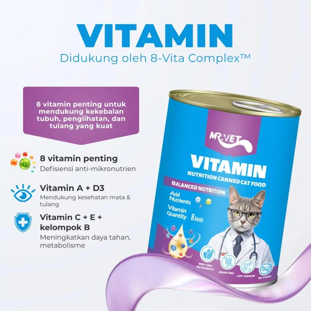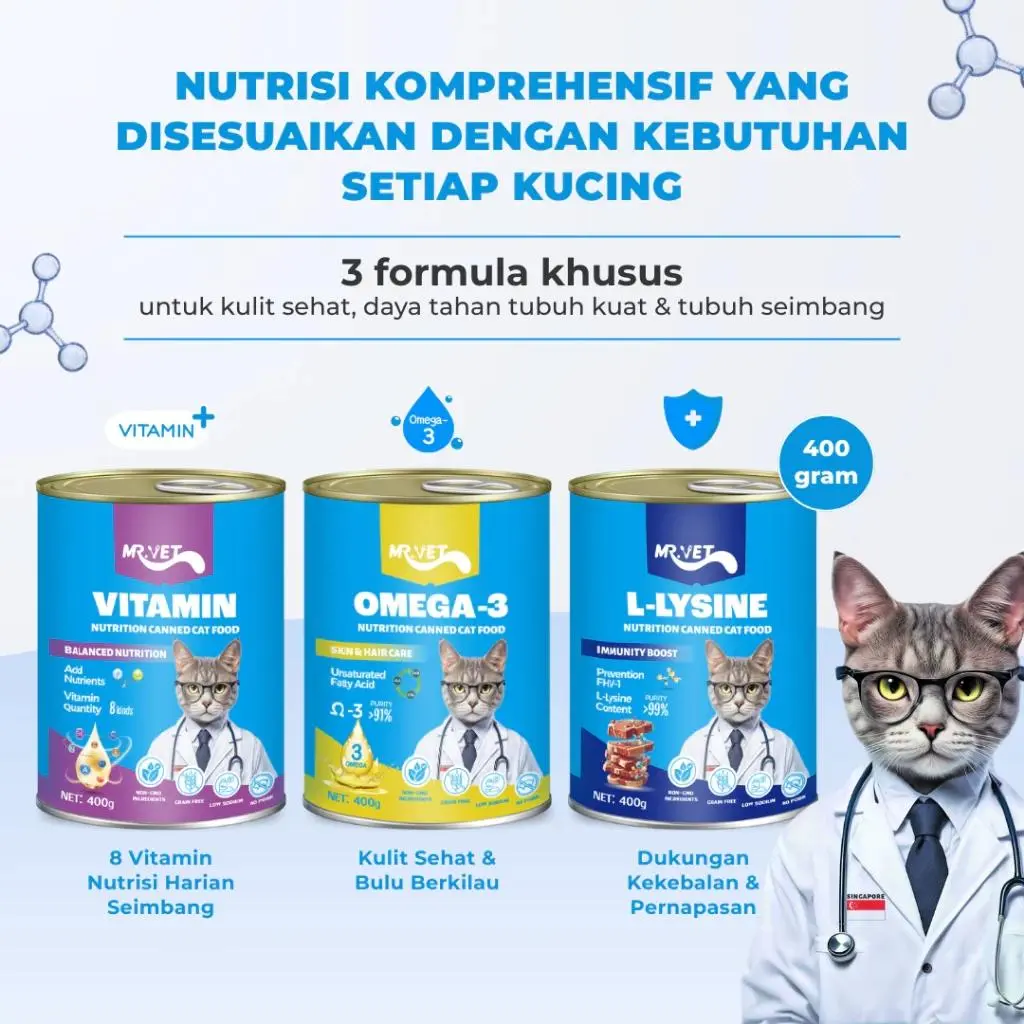 - Mr. Vet: Makanan kucing berprotein tinggi yang terbuat dari bahan-bahan berbasis hewani premium, cocok untuk kucing dari segala usia, termasuk anak kucing, kucing dewasa, dan kucing hamil.